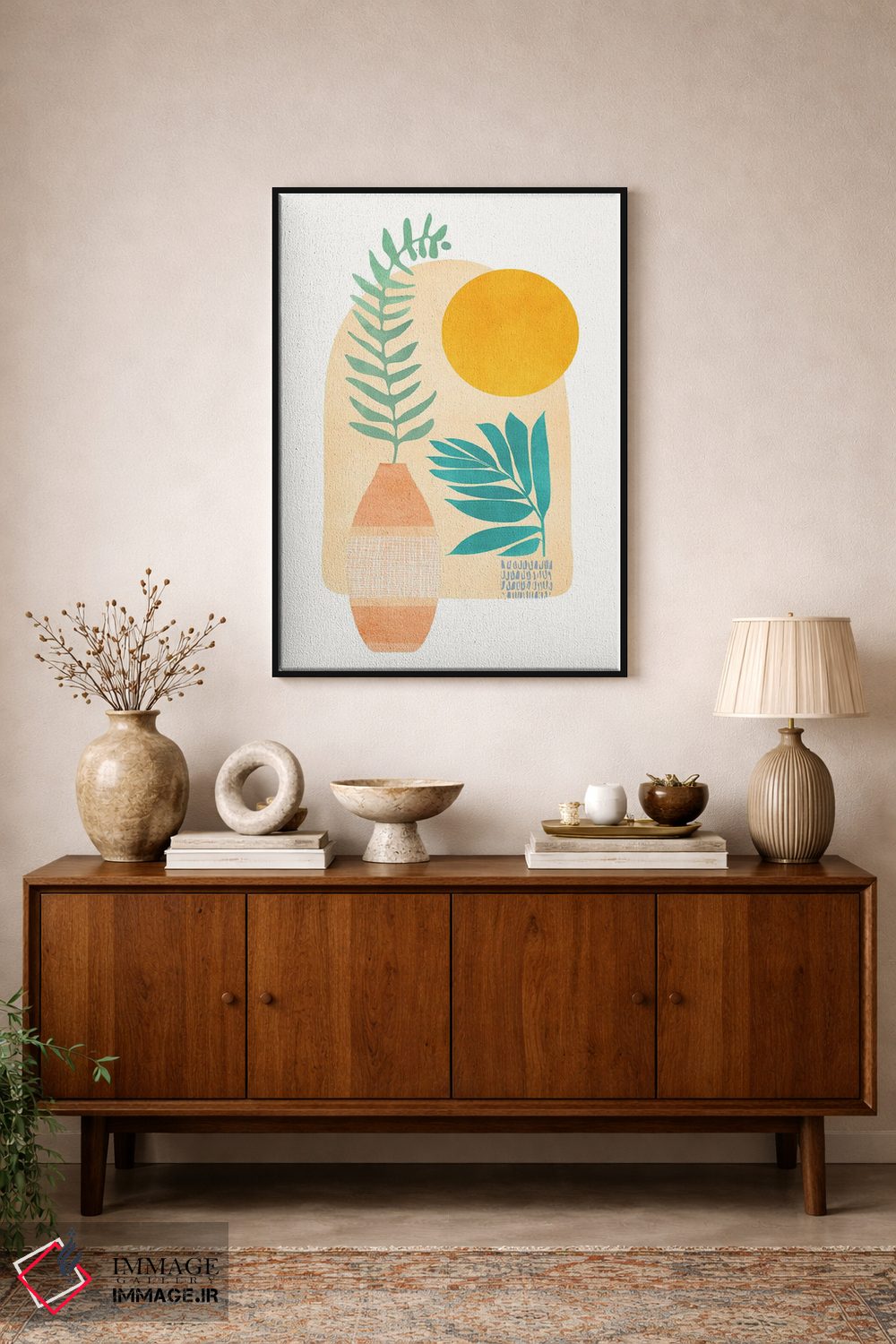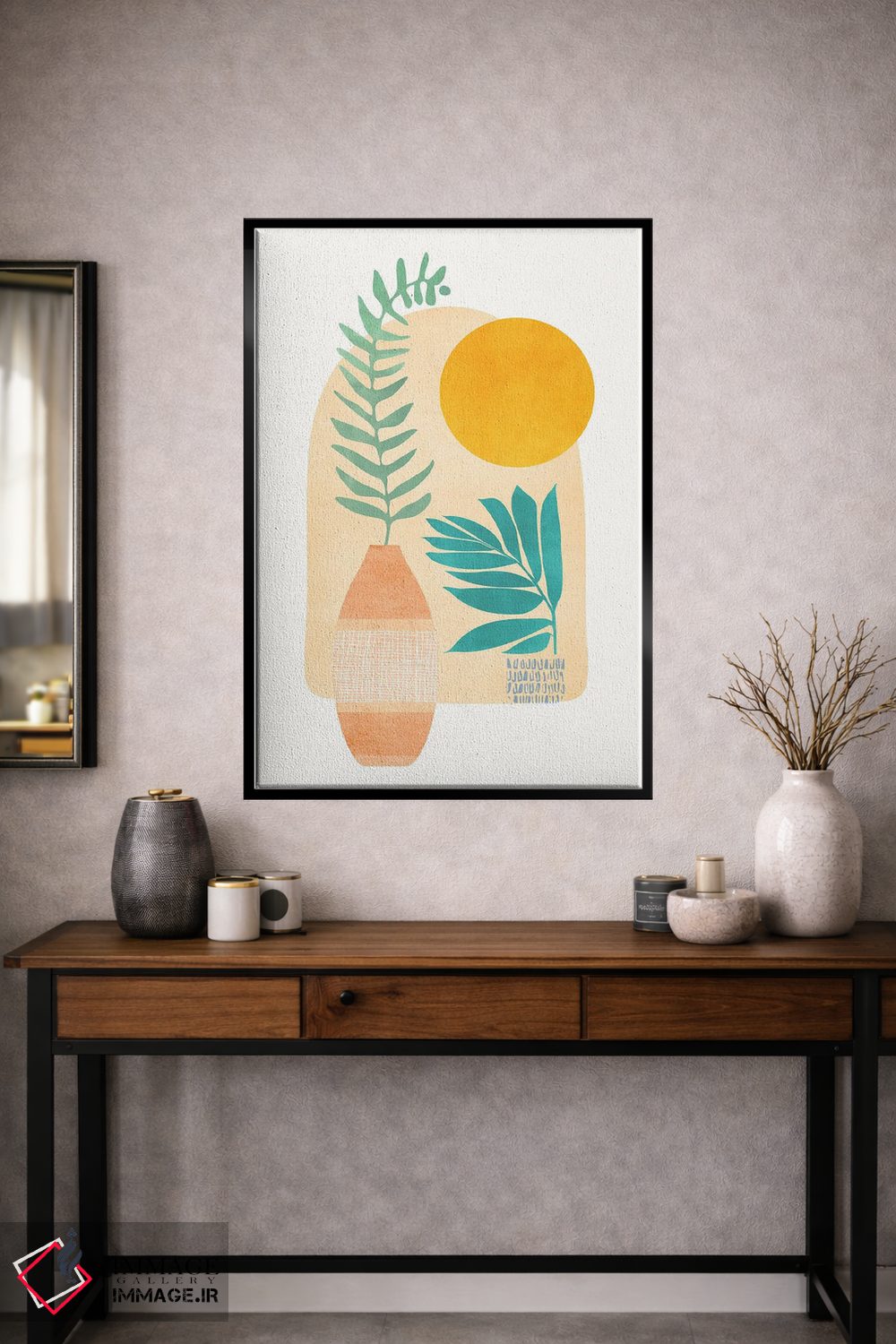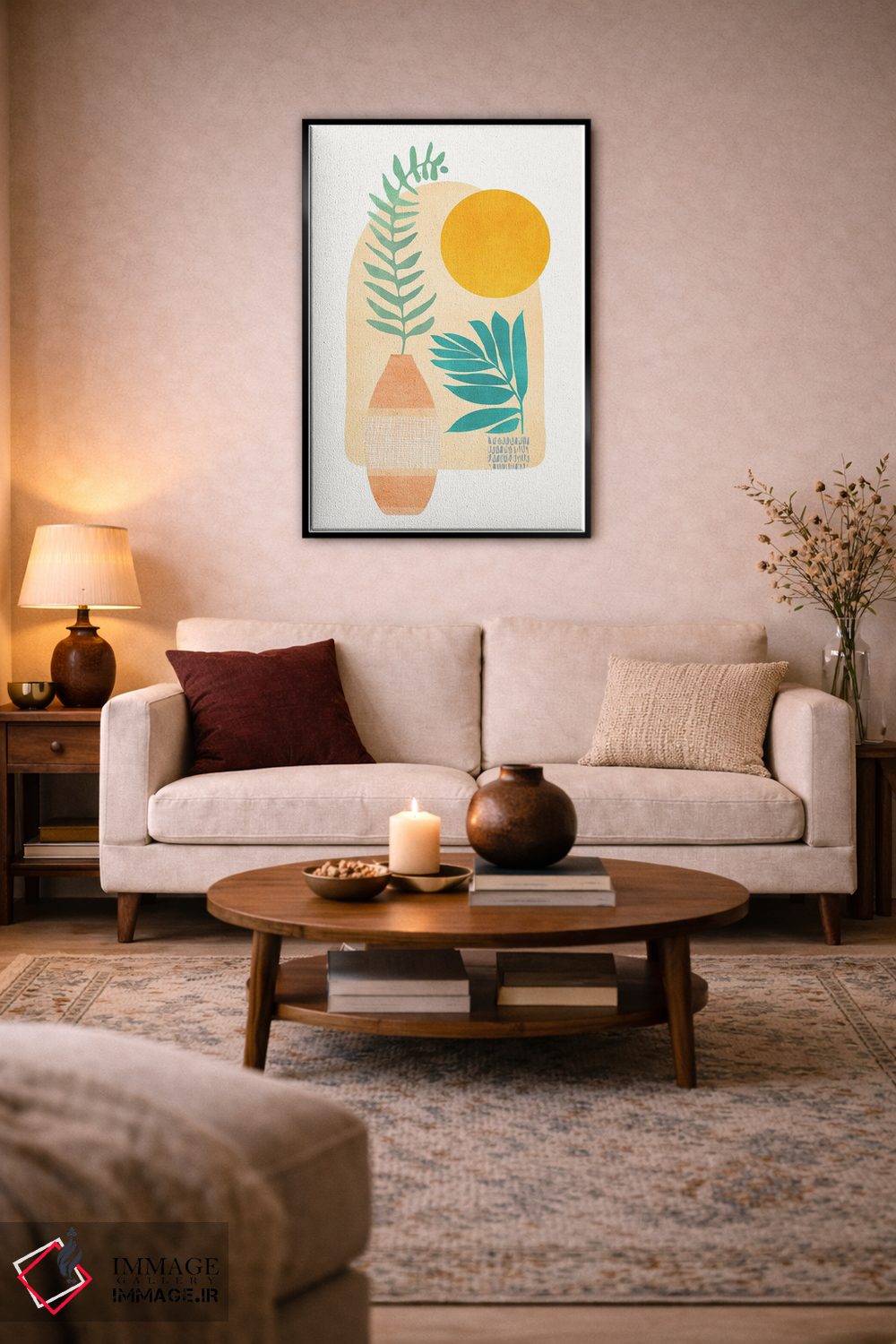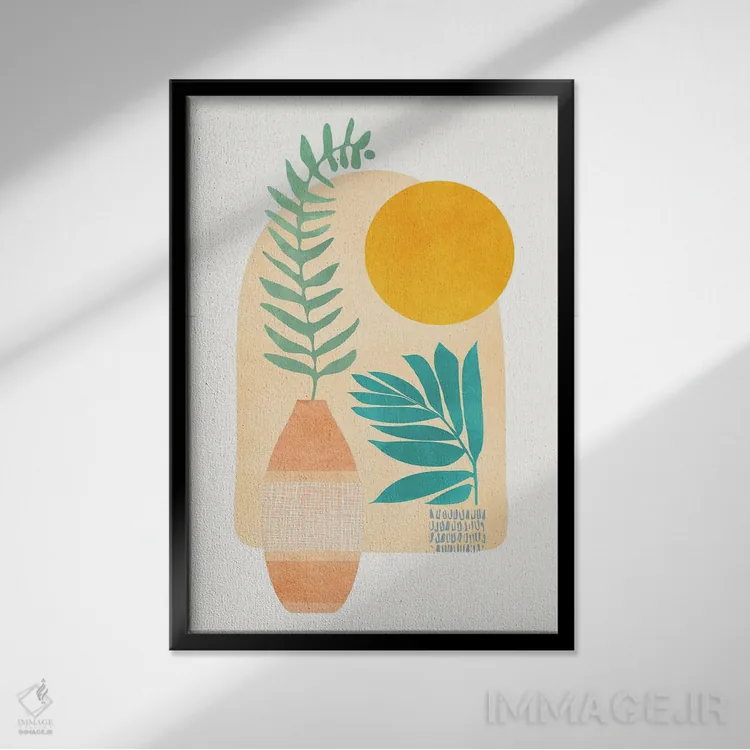 براساس پالت ترکیبی اثر، قاب بلوط روشن (چوبی) پیشنهاد اول است و استخوانی ملایم مکمل. برای سفارشهای پروژهای با ابعاد و قابهای اختصاصی با ایماژ در تماس باشید.