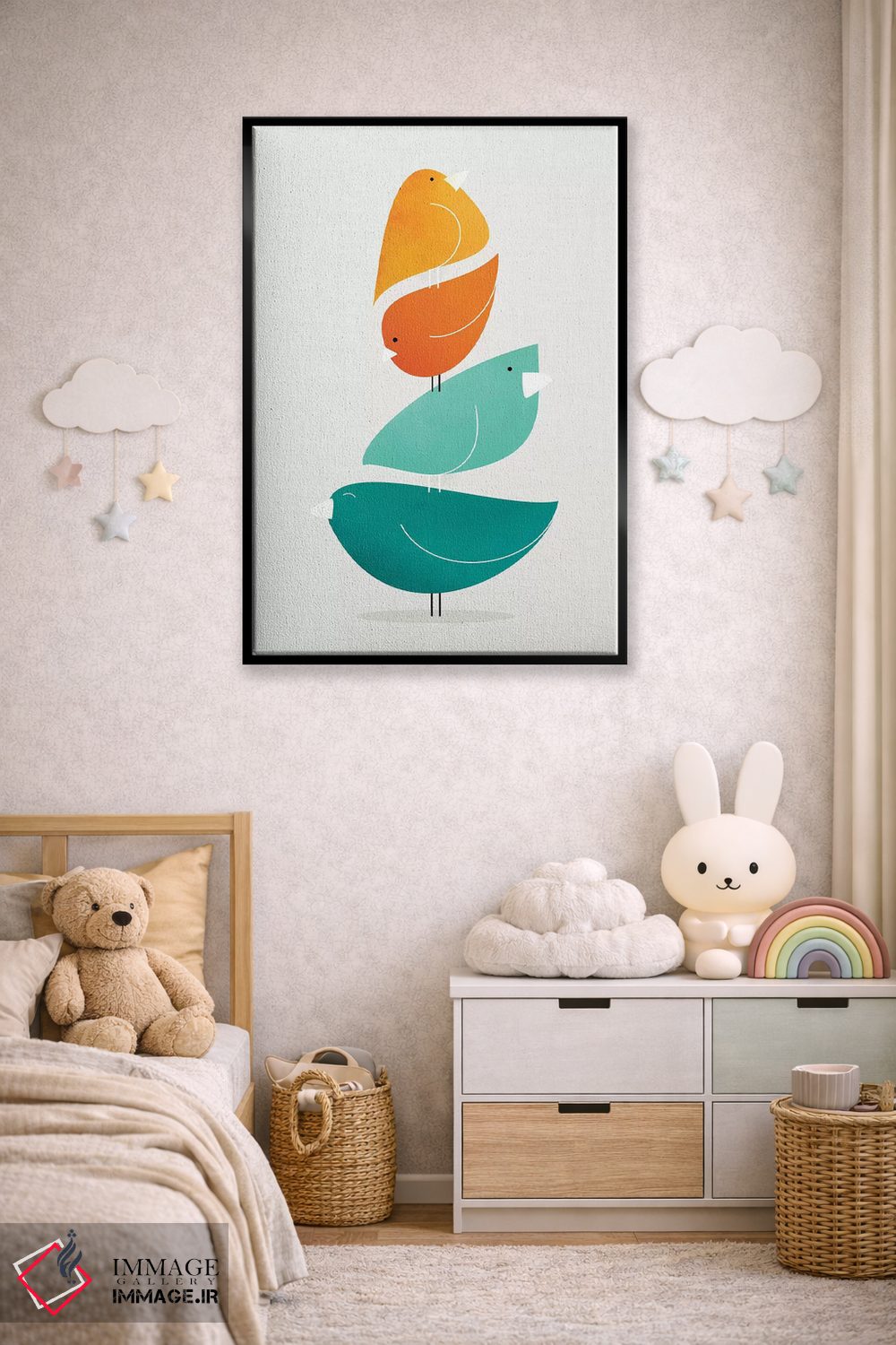 برای دکورهای صمیمی، «دسته پرندگان II» اثرِ «مدرن تروپیکال (برند/استودیوی هنری)» به دیوار، انرژیِ نرم و زنده میدهد؛ برای نشیمنهای خانوادگی انتخابی خوشسلیقه است. برای دیوار گالریوار هم گزینهٔ خوبیست.
