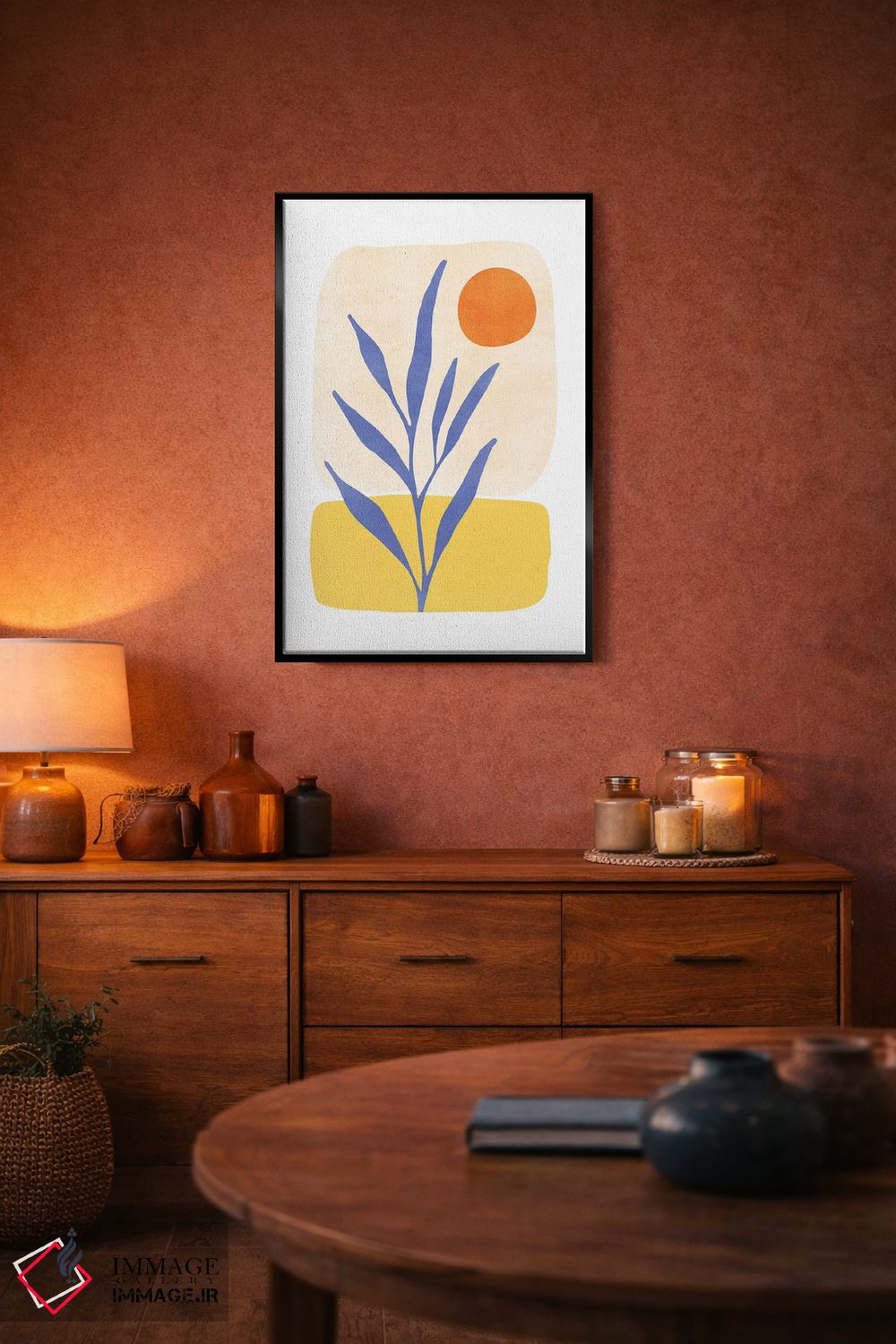 براساس پالت ترکیبی اثر، قاب تیک گرم (چوبی) پیشنهاد اول است و مشکی مات (فریم متوسط) مکمل. برای سفارشهای پروژهای با ابعاد و قابهای اختصاصی با ایماژ در تماس باشید.