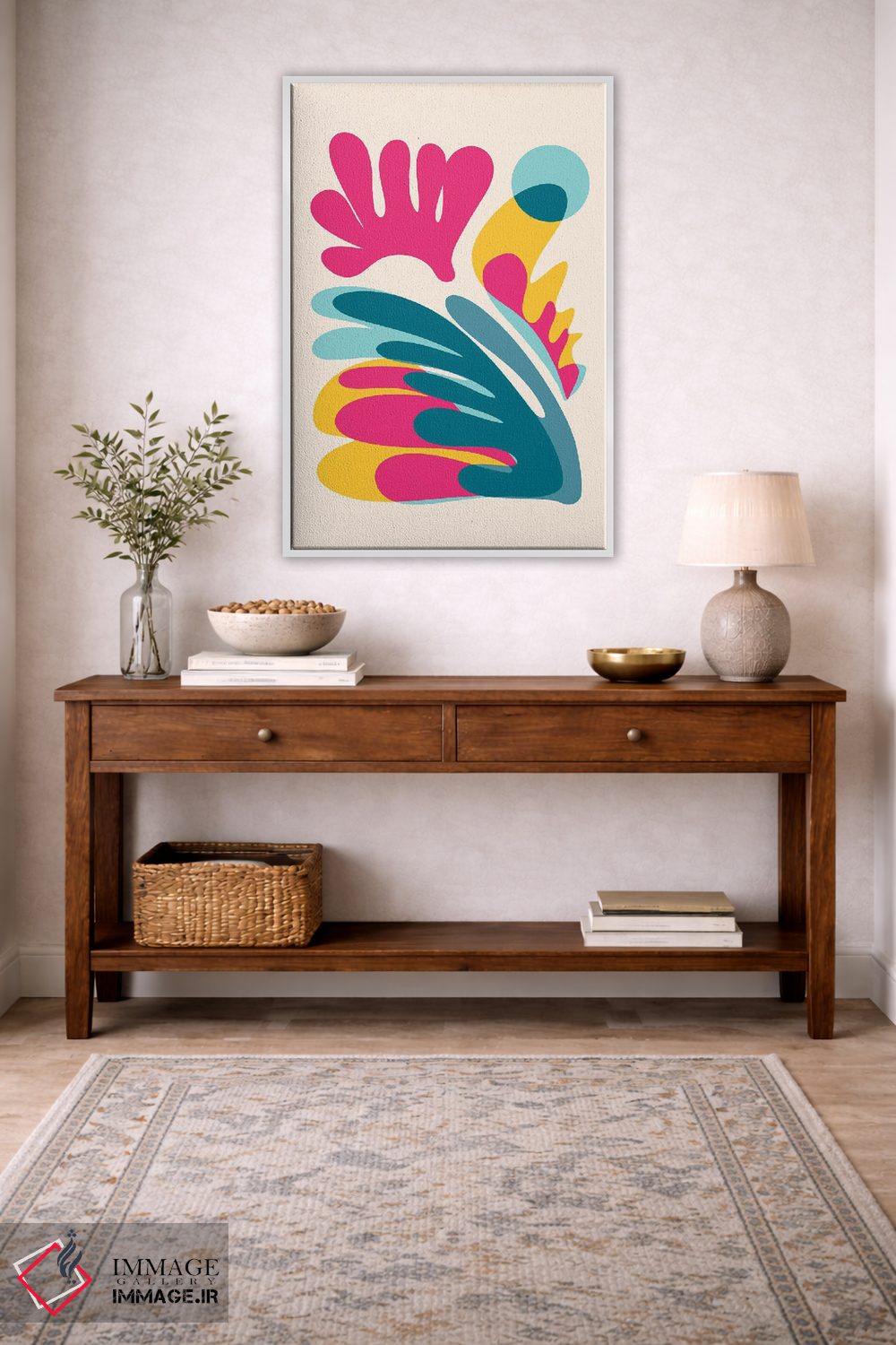 «پاشیدن» اثرِ «مدرن تروپیکال (برند/استودیوی هنری)» مثل یک نفس تازه است؛ تعادل رنگیِ لطیفی به چیدمان میدهد؛ برای کنار میز آرایش یا کنسول انتخابی خوشسلیقه است. حضورش آرام است، اما بیاثر نیست.