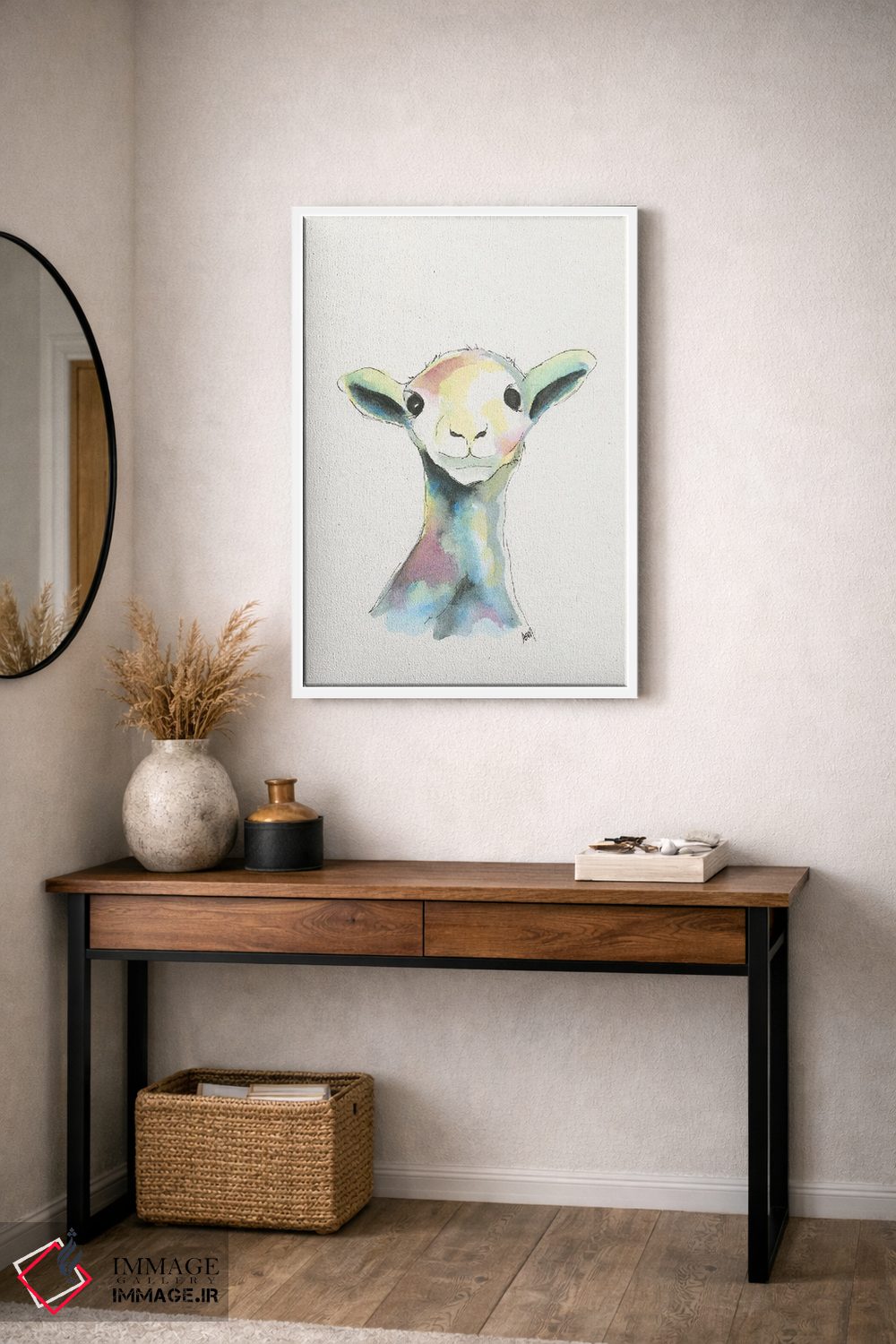 برای دیوارهای ساده، «بره آبرنگی برای اتاق کودک» اثرِ «آپریل موفات» فضا را صمیمیتر و دعوتکنندهتر نشان میدهد؛ برای اتاق کودک (بدون لحن کودکانه) انتخابی خوشسلیقه است. هر بار نگاهش میکنید، یک جزئیات تازه به چشم میآید.
