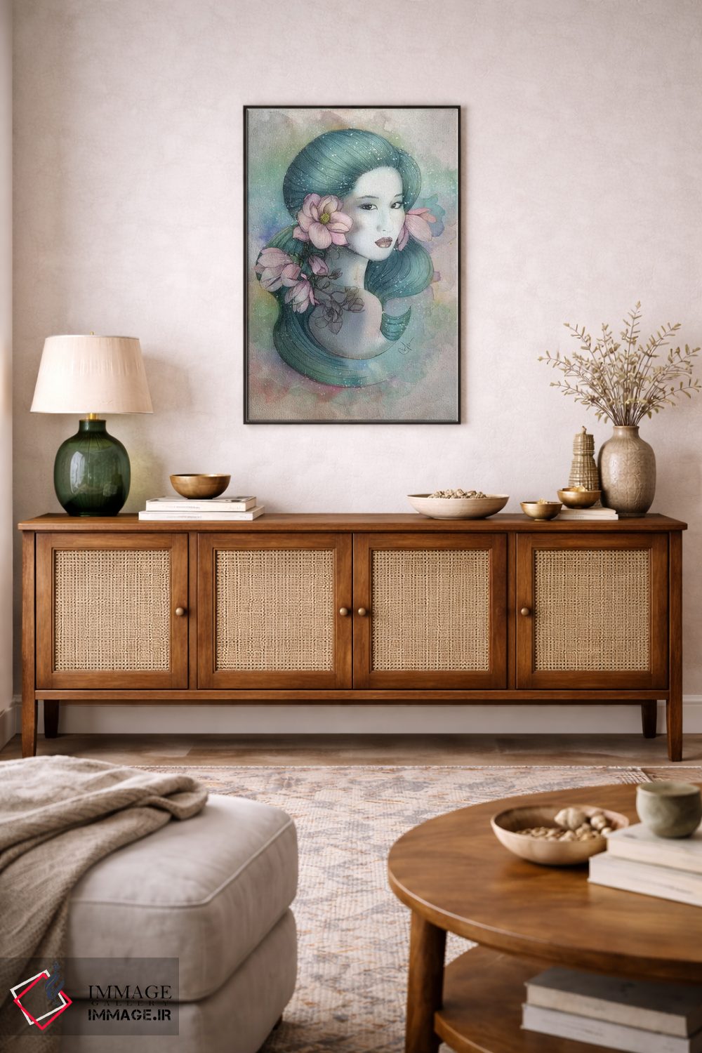 براساس پالت ترکیبی اثر، قاب تیک گرم (چوبی) پیشنهاد اول است و مشکی مات (فریم متوسط) مکمل. برای سفارشهای پروژهای با ابعاد و قابهای اختصاصی با ایماژ در تماس باشید.