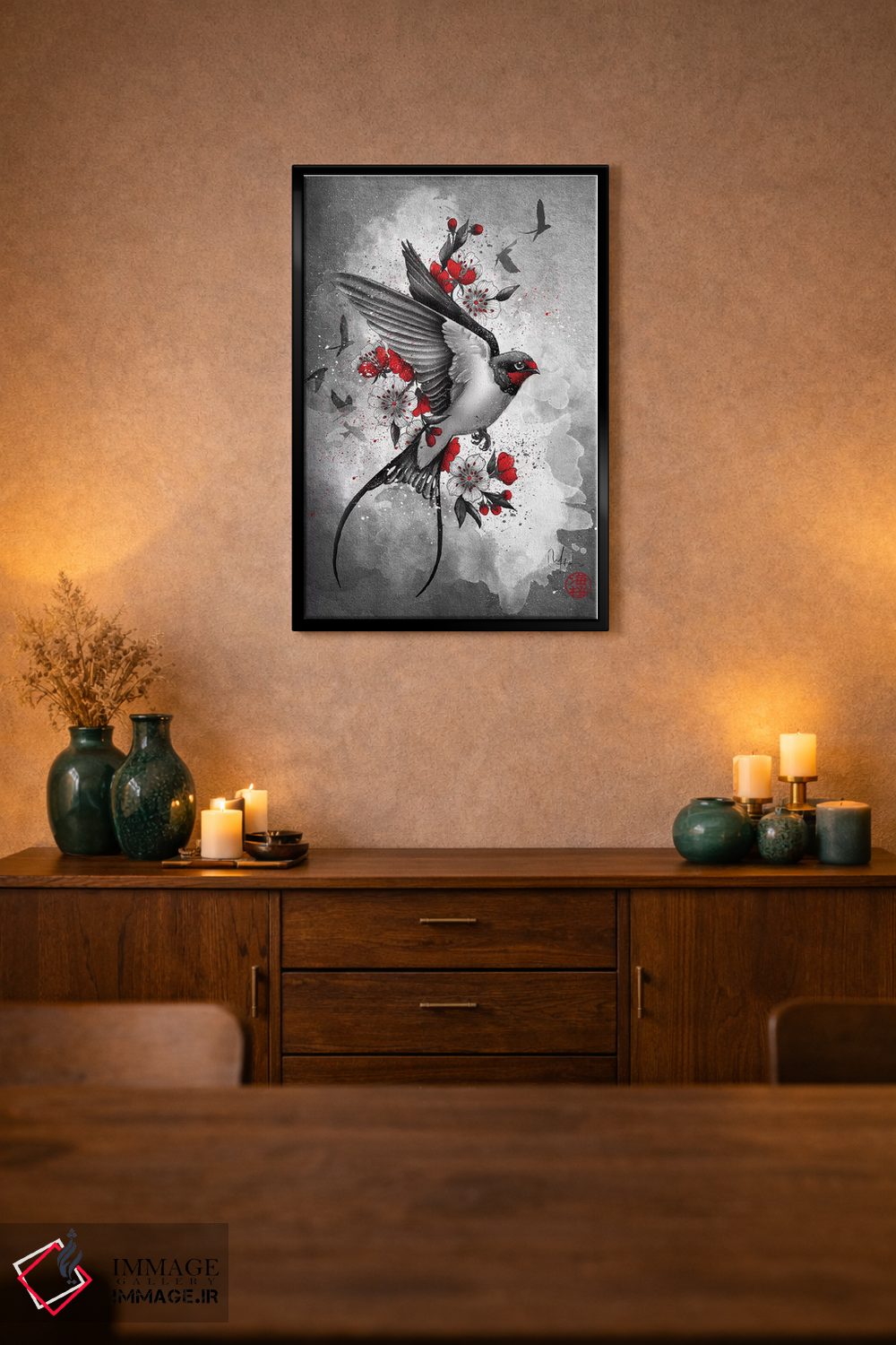 «پرستوها و شکوفههای گیلاس» اثرِ «مارین لوپ» میتواند برای دیوارهای ساده، یک لطافتِ دقیق بسازد؛ برای هدیه دادن پیشنهاد میشود. با قاب روشن یا چوبی، حس طبیعیتری پیدا میکند.