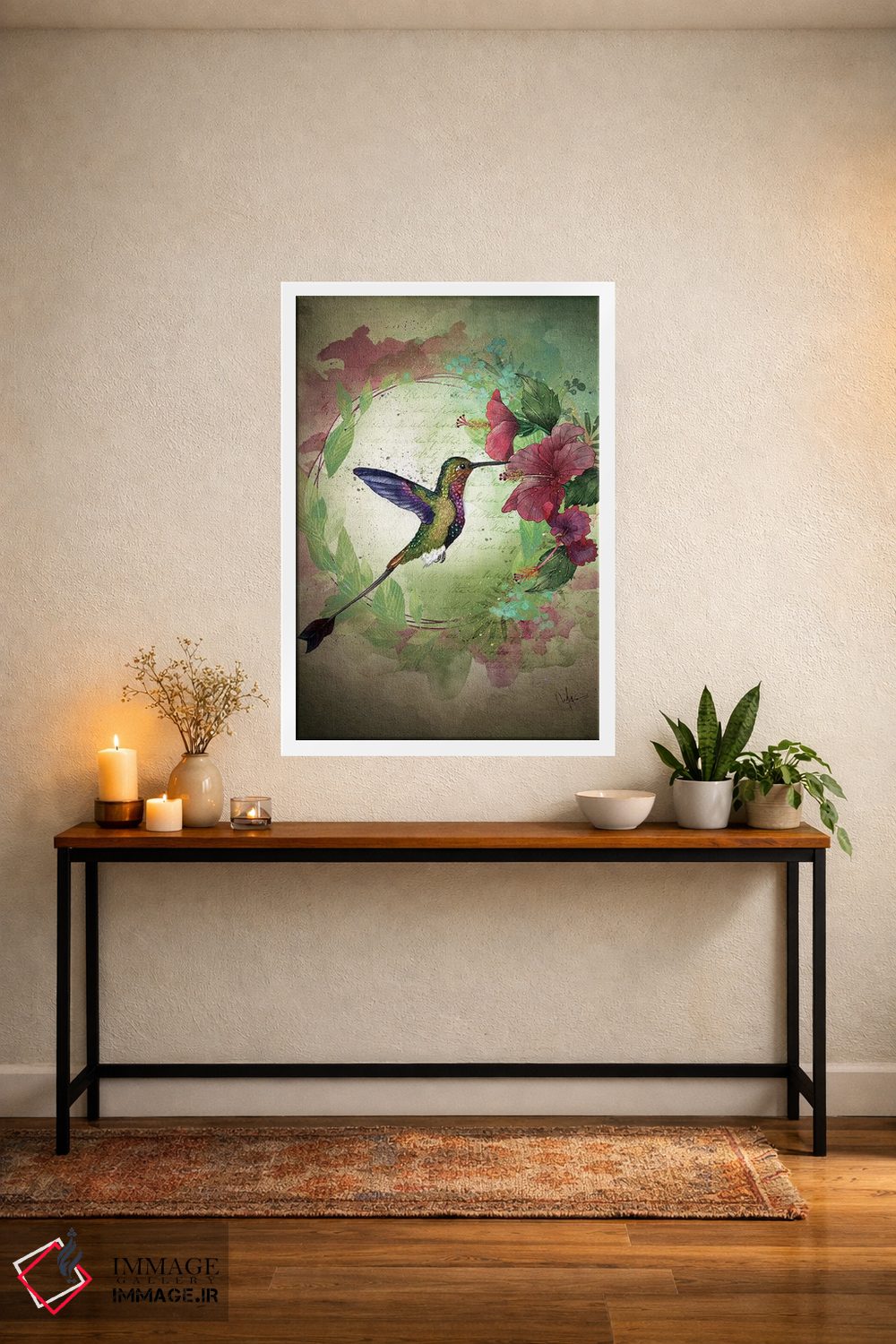 براساس پالت ترکیبی اثر، قاب بلوط روشن (چوبی) پیشنهاد اول است و استخوانی ملایم مکمل. برای سفارشهای پروژهای با ابعاد و قابهای اختصاصی با ایماژ در تماس باشید.