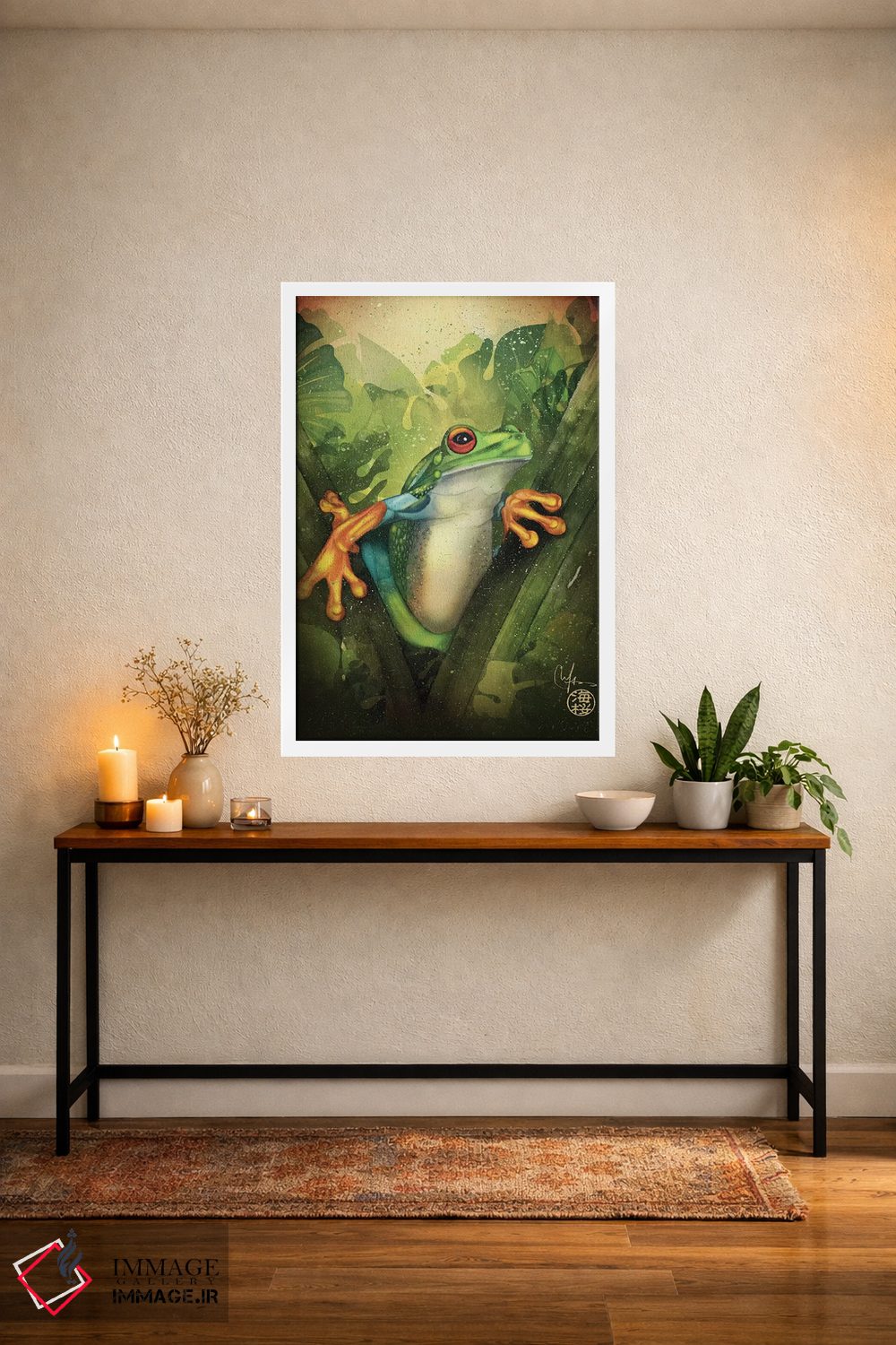 برای دیوارهای ساده، «قورباغه» اثرِ «مارین لوپ» در کنار رنگهای خنثی، تضاد دلچسبی میسازد؛ برای دیوار کنار میز کار انتخابی خوشسلیقه است. به دیوار، قصه میدهد—اما قصهای آرام و شیک.