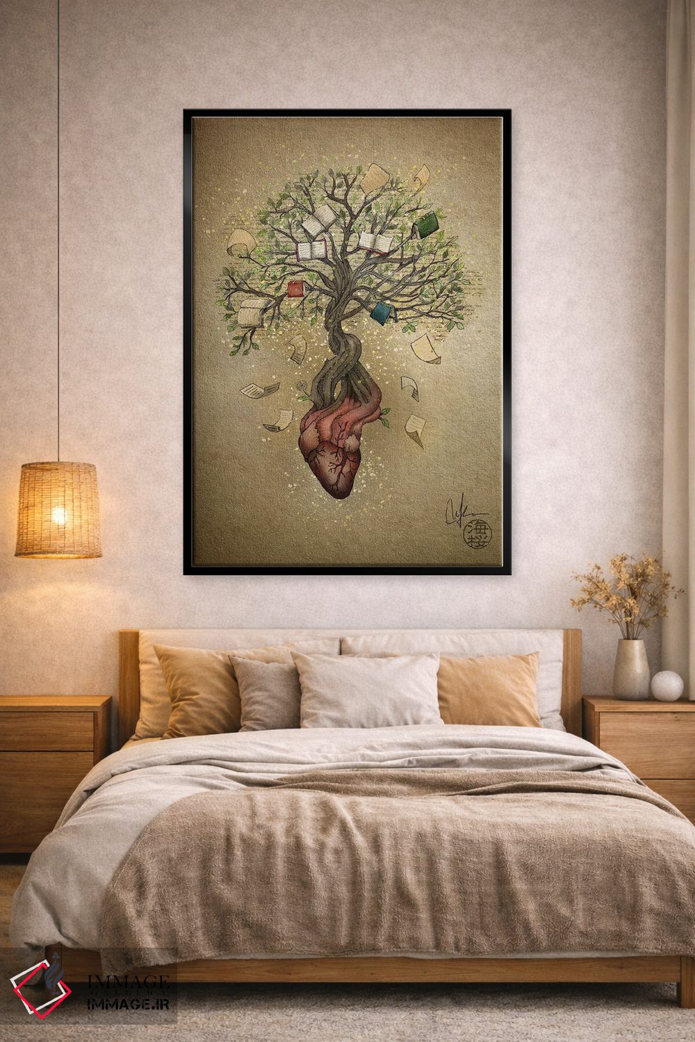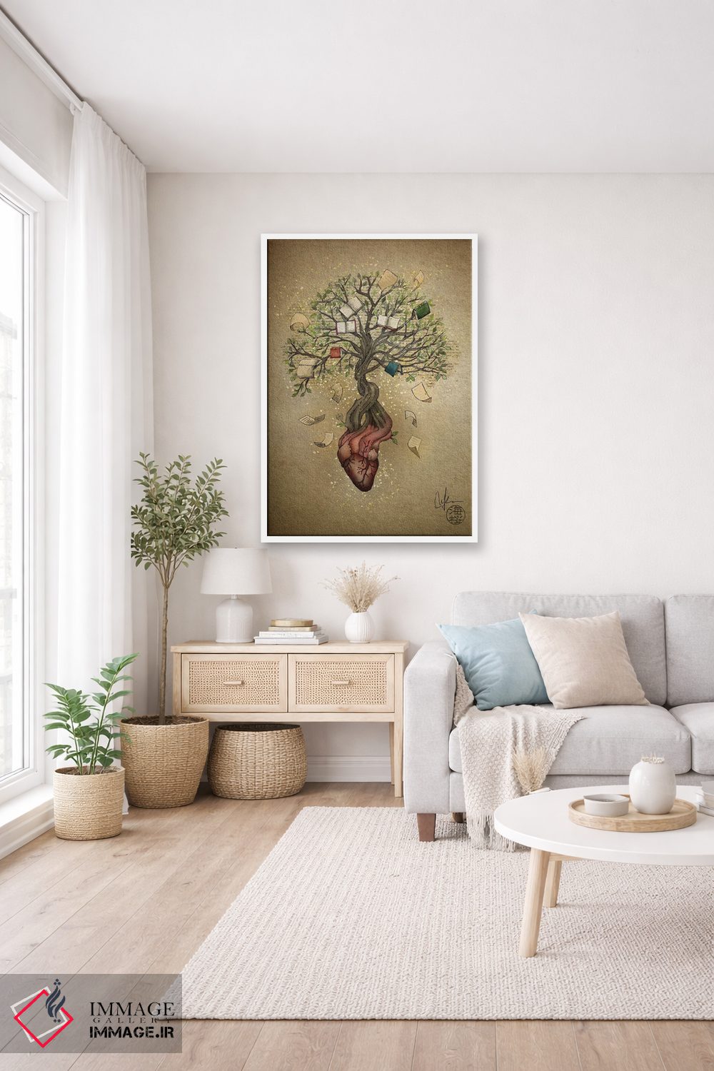 براساس پالت گرم اثر، قاب بلوط روشن (چوبی) پیشنهاد اول است و استخوانی ملایم مکمل. برای سفارشهای پروژهای با ابعاد و قابهای اختصاصی با ایماژ در تماس باشید.