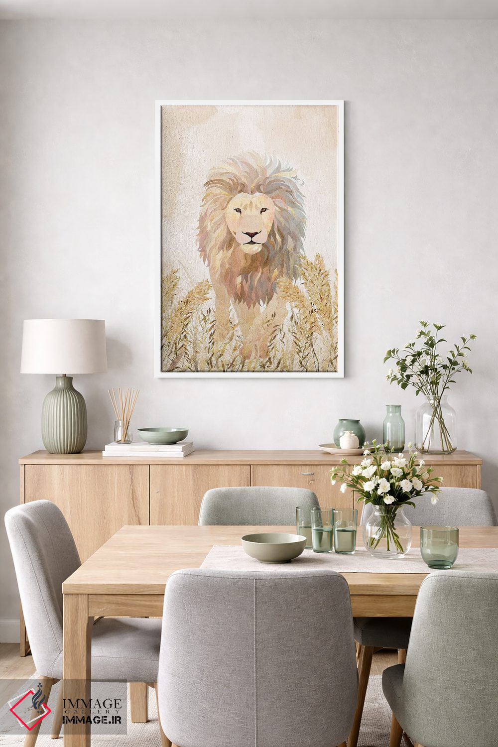 براساس پالت گرم اثر، قاب بلوط روشن (چوبی) پیشنهاد اول است و استخوانی ملایم مکمل. برای سفارشهای پروژهای با ابعاد و قابهای اختصاصی با ایماژ در تماس باشید.