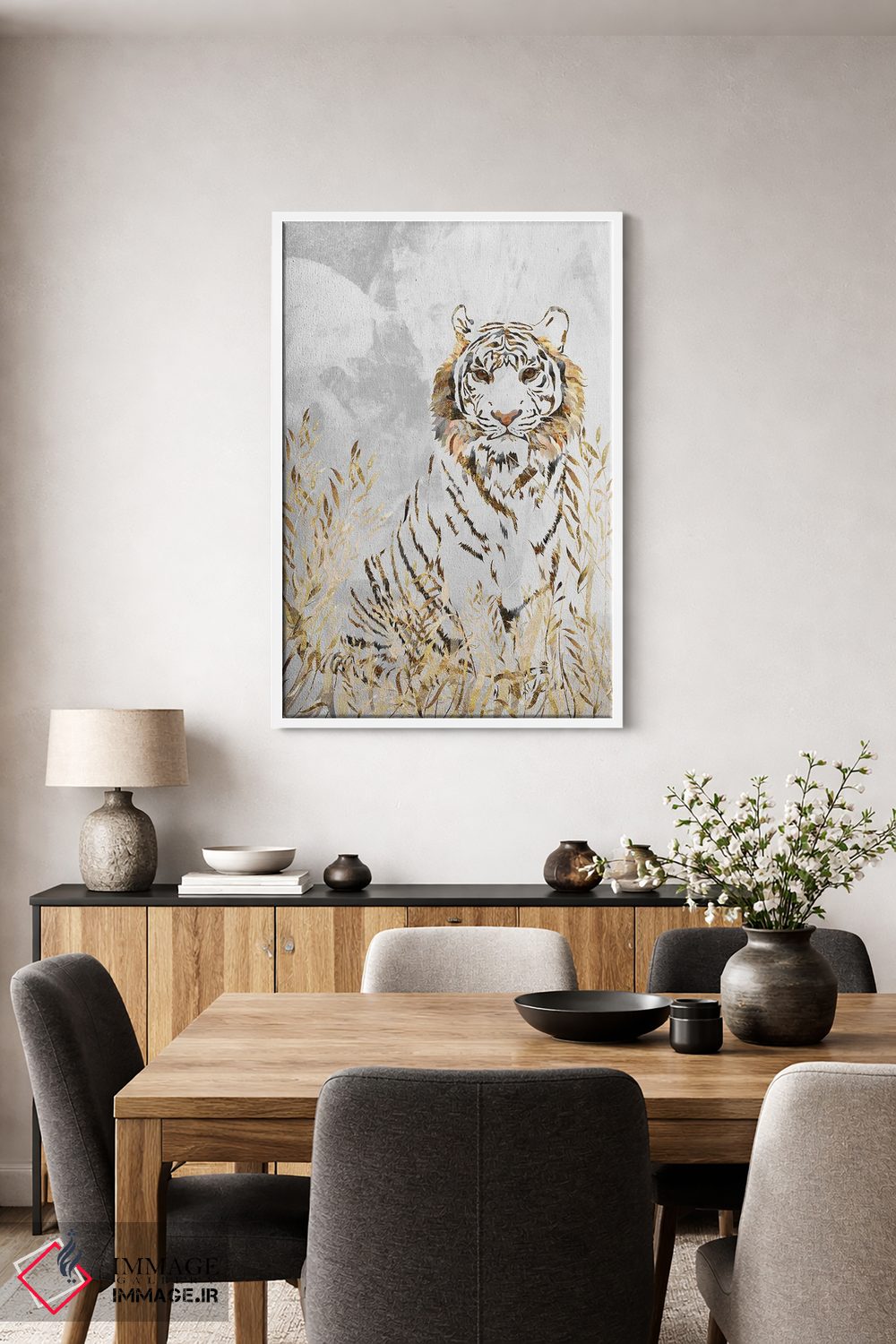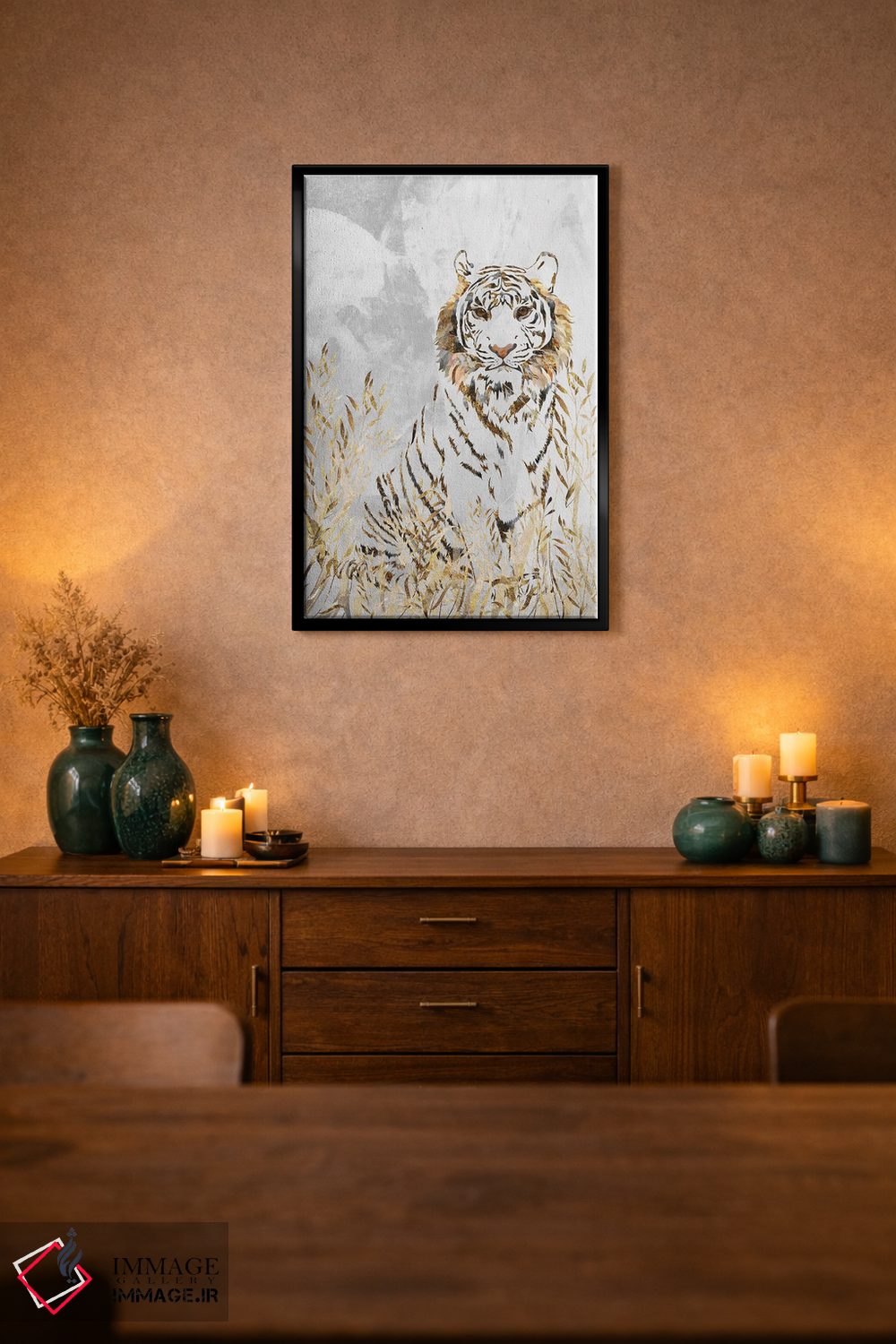 براساس پالت گرم اثر، قاب بلوط روشن (چوبی) پیشنهاد اول است و استخوانی ملایم مکمل. برای سفارشهای پروژهای با ابعاد و قابهای اختصاصی با ایماژ در تماس باشید.