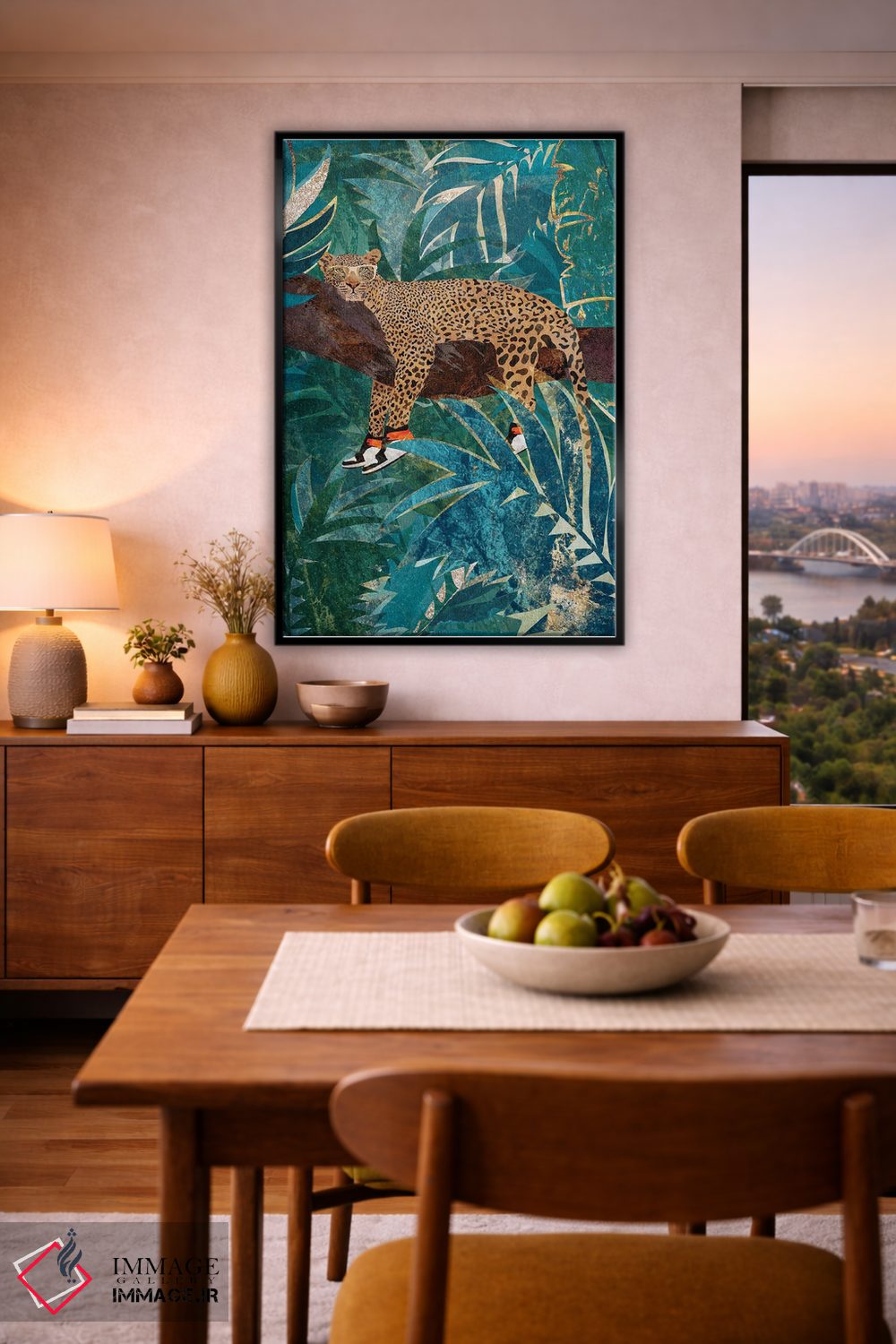 این اثر با عنوان «پلنگ با کفش ورزشی» اثرِ «سارا مانوفسکی» به دیوار، انرژیِ نرم و زنده میدهد؛ برای راهروها و ورودیهای گرم انتخابی خوشسلیقه است. برای دیوار گالریوار هم گزینهٔ خوبیست.