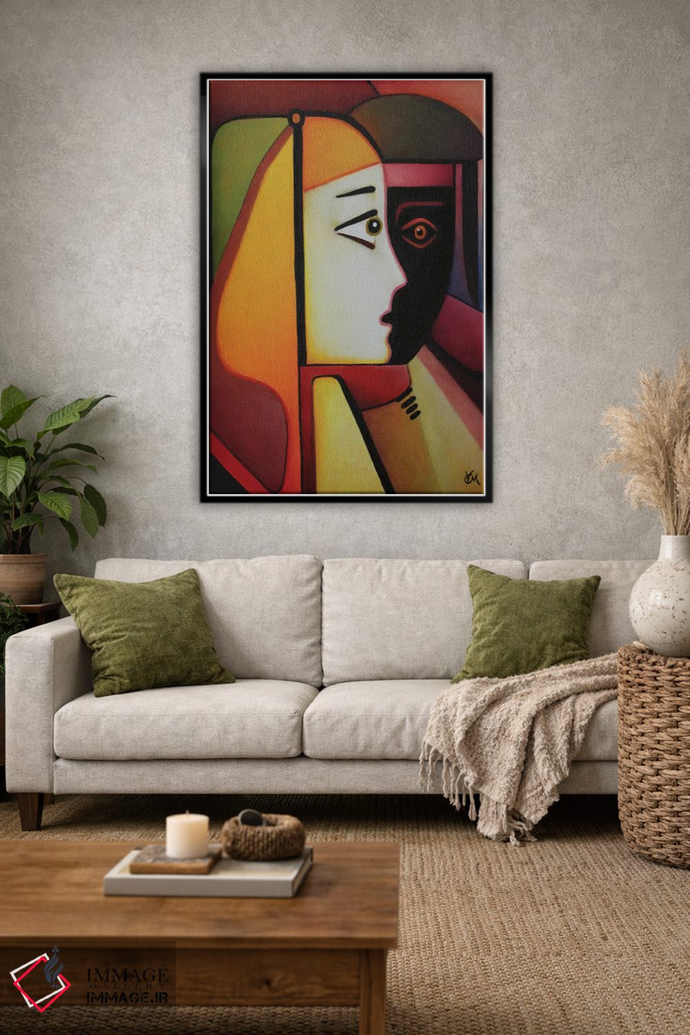 براساس پالت ترکیبی اثر، قاب تیک گرم (چوبی) پیشنهاد اول است و مشکی مات (فریم متوسط) مکمل. برای سفارشهای پروژهای با ابعاد و قابهای اختصاصی با ایماژ در تماس باشید.