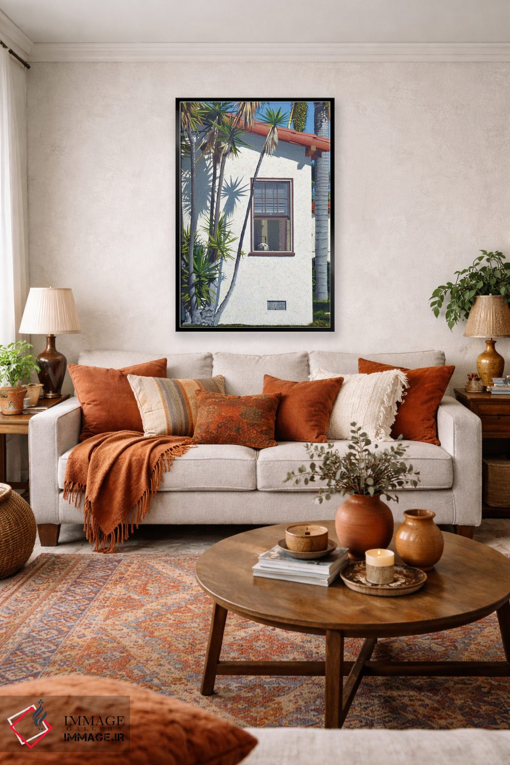 براساس پالت ترکیبی اثر، قاب تیک گرم (چوبی) پیشنهاد اول است و مشکی مات (فریم متوسط) مکمل. برای سفارشهای پروژهای با ابعاد و قابهای اختصاصی با ایماژ در تماس باشید.