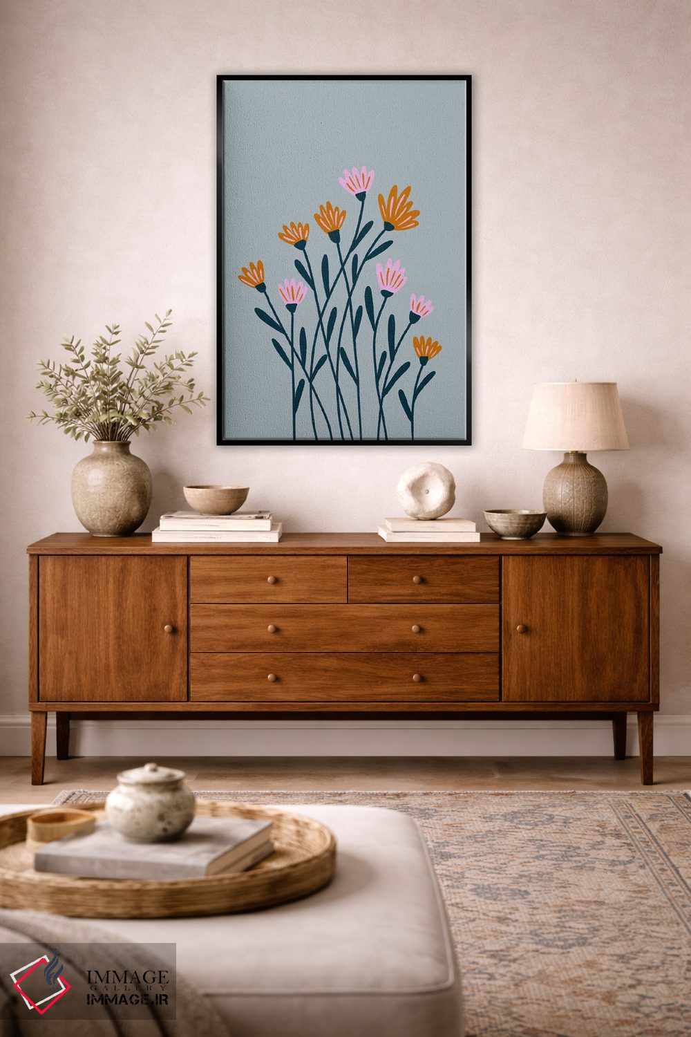 اگر به دکورهای طبیعی علاقه دارید، «گلهای نارنجی و صورتی» اثرِ «آنجلا مینکا» برای دیوارهای ساده، یک لطافتِ دقیق میسازد، برای کنار میز آرایش یا کنسول گزینهٔ مناسبیست. جزئیاتش از نزدیک هم ارزش تماشا دارد.