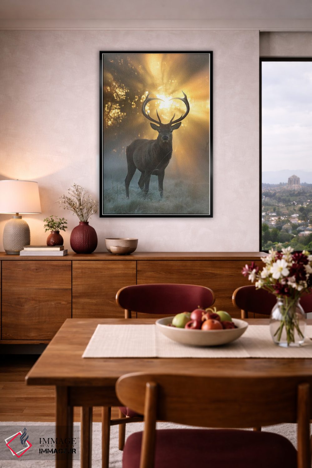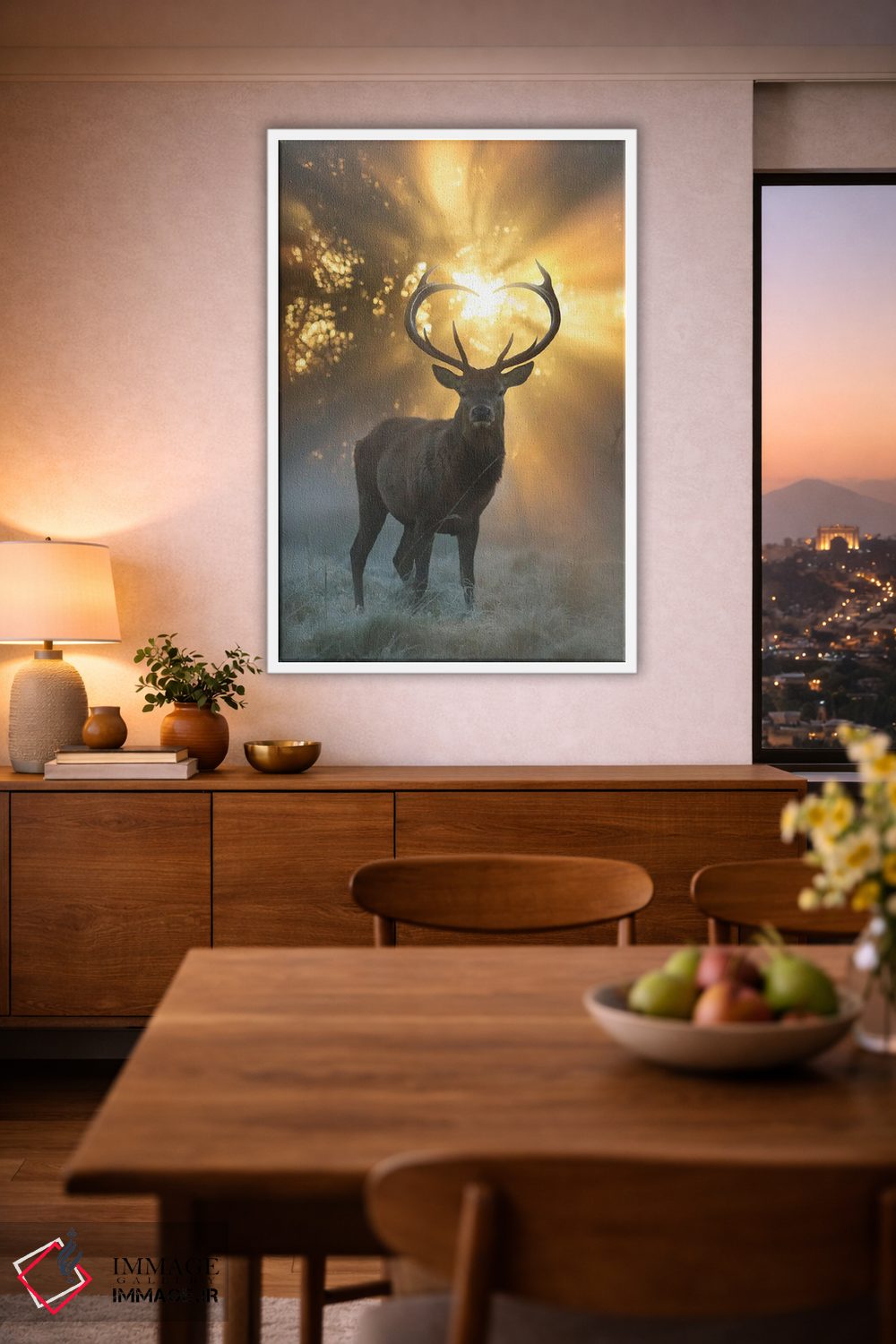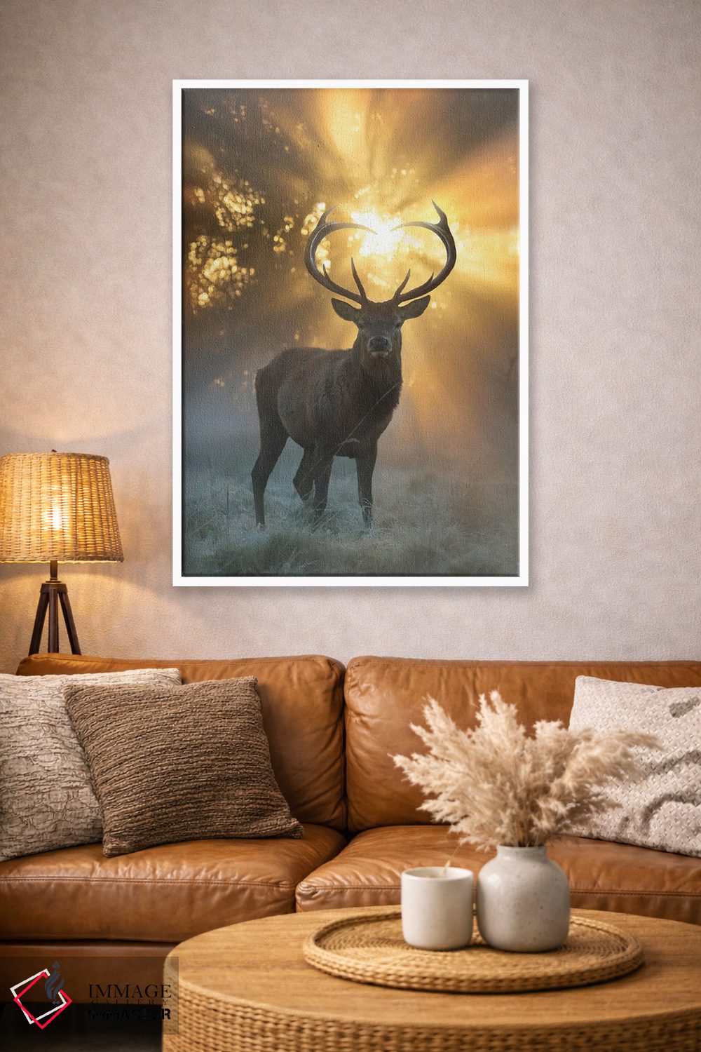براساس پالت گرم اثر، قاب بلوط روشن (چوبی) پیشنهاد اول است و استخوانی ملایم مکمل. برای سفارشهای پروژهای با ابعاد و قابهای اختصاصی با ایماژ در تماس باشید.