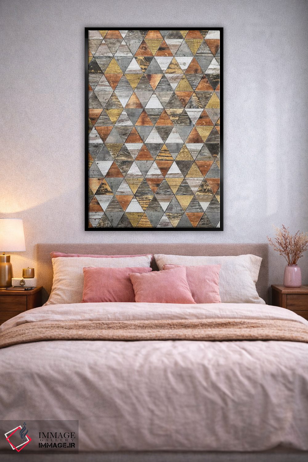 براساس پالت گرم اثر، قاب بلوط روشن (چوبی) پیشنهاد اول است و استخوانی ملایم مکمل. برای سفارشهای پروژهای با ابعاد و قابهای اختصاصی با ایماژ در تماس باشید.