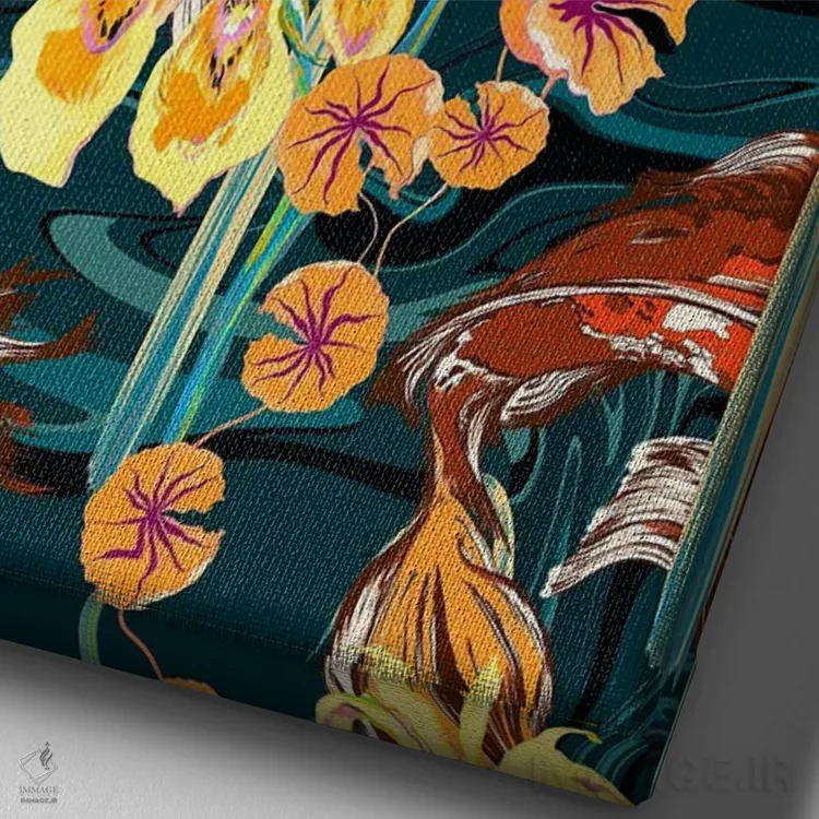 اگر به دکورهای طبیعی علاقه دارید، «حوض ماهی کوی آبی—پترولی» اثرِ «مریلین مَدو» حس فصل را آرام وارد فضا میکند، برای کنار میز آرایش یا کنسول گزینهٔ مناسبیست. با قاب روشن یا چوبی، حس طبیعیتری پیدا میکند.