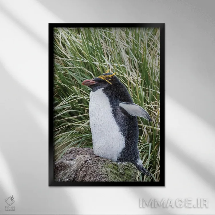 تابلو دکوراتیو پنگوئن ماکارونی ایستاده در کلونی، میان علفزارهای متراکم توس… اثر مارتین زویک