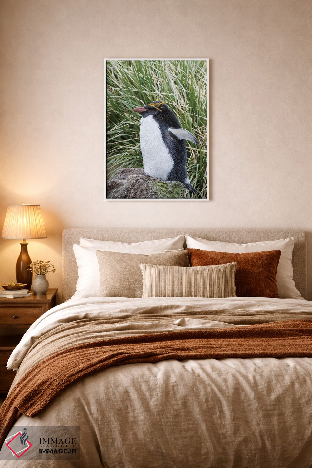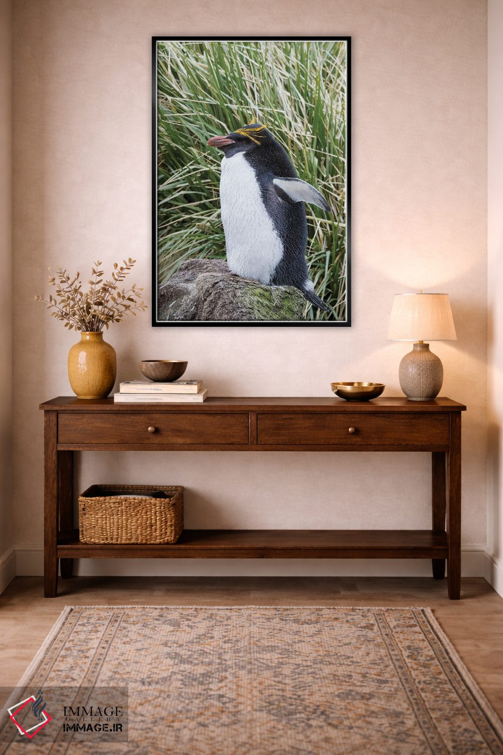 «پنگوئن ماکارونی ایستاده در کلونی، میان علفزارهای متراکم توساک» اثرِ «مارتین زویک» از آن کارهاییست که فضا را صمیمیتر و دعوتکنندهتر نشان میدهد؛ برای کافههای کوچک و صمیمی انتخاب خوبیست. هم فضا را گرم میکند، هم شلوغش نمیکند.