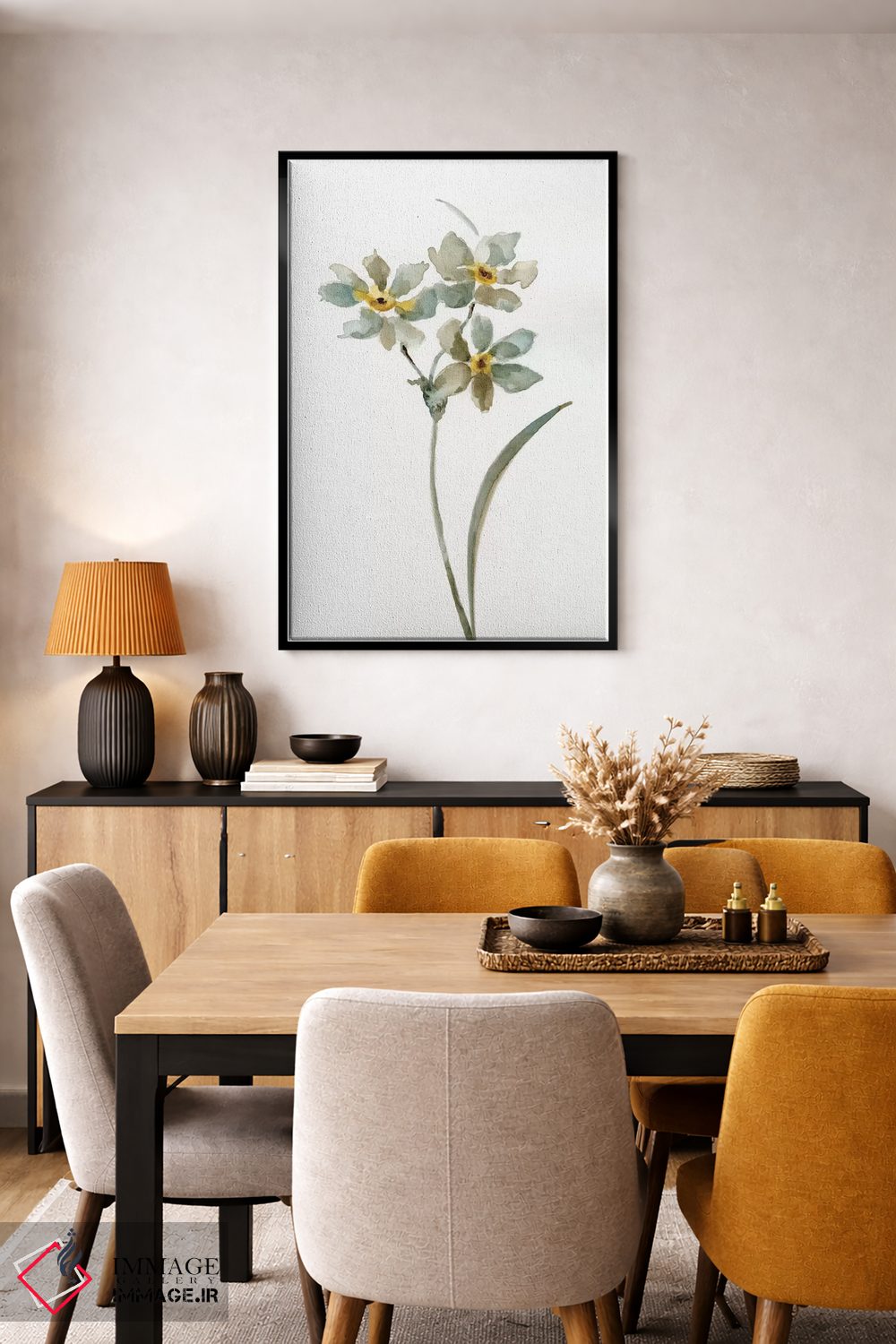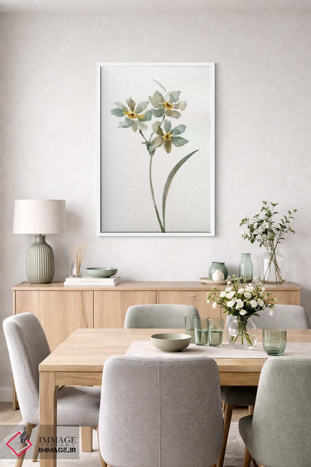 برای فضاهایی که به لطافت نیاز دارند، «گیاهی خنثی یک» اثرِ «نان» تعادل رنگیِ لطیفی به چیدمان میدهد؛ برای دکورهای اسکانباوراوی انتخابی خوشسلیقه است. فضا را شلوغ نمیکند؛ فقط لطیفترش میکند.