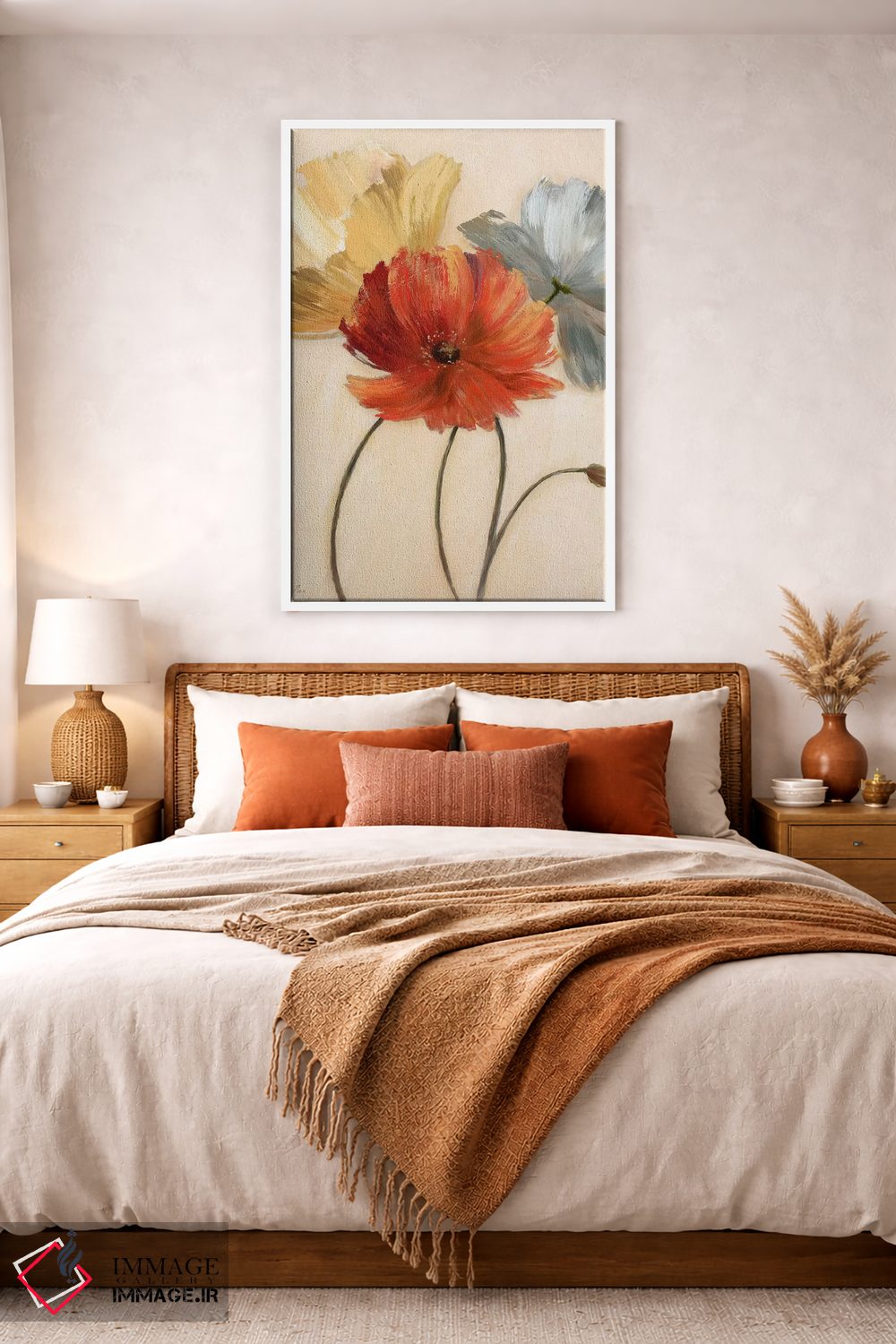 براساس پالت گرم اثر، قاب بلوط روشن (چوبی) پیشنهاد اول است و استخوانی ملایم مکمل. برای سفارشهای پروژهای با ابعاد و قابهای اختصاصی با ایماژ در تماس باشید.