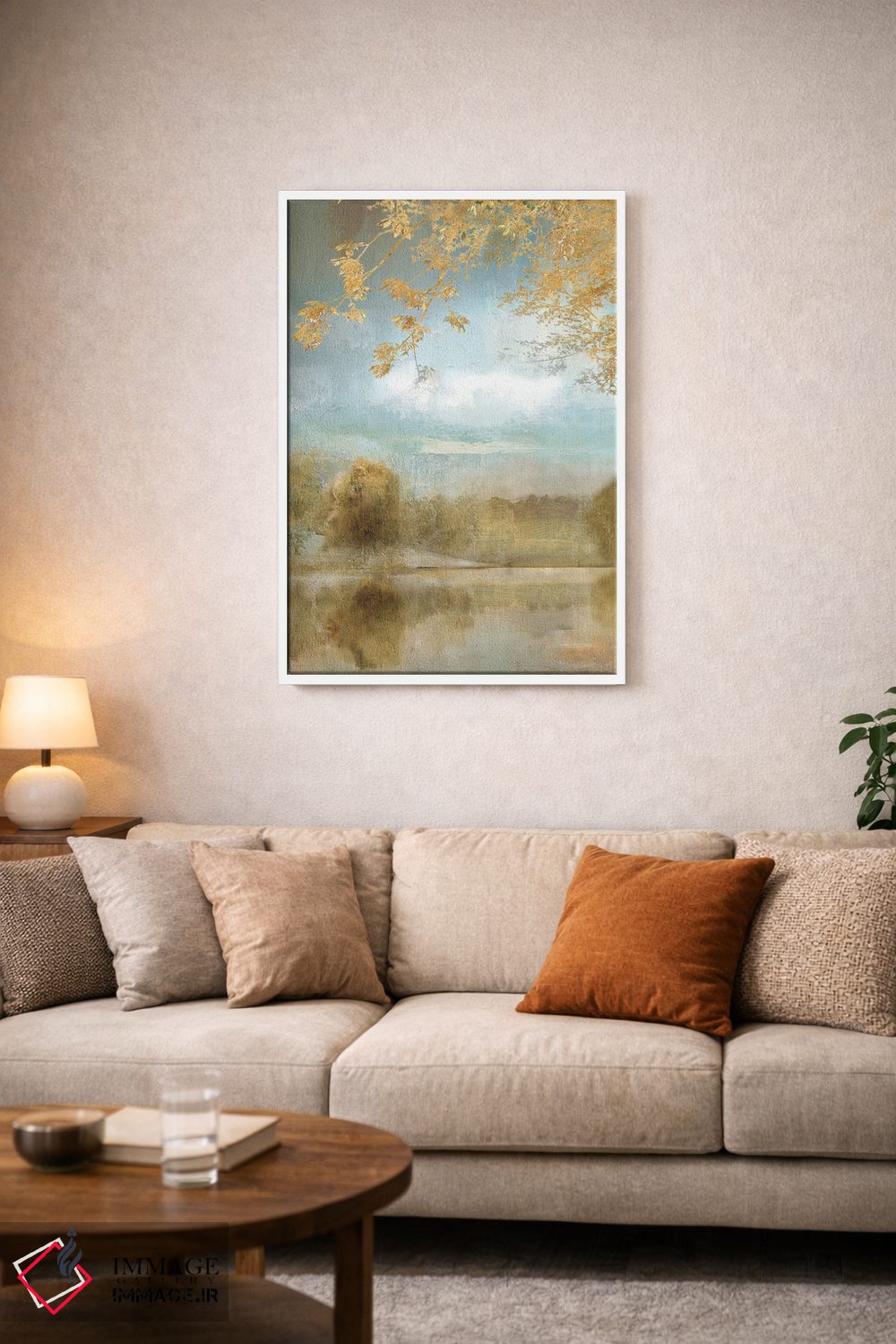 براساس پالت گرم اثر، قاب بلوط روشن (چوبی) پیشنهاد اول است و استخوانی ملایم مکمل. برای سفارشهای پروژهای با ابعاد و قابهای اختصاصی با ایماژ در تماس باشید.
