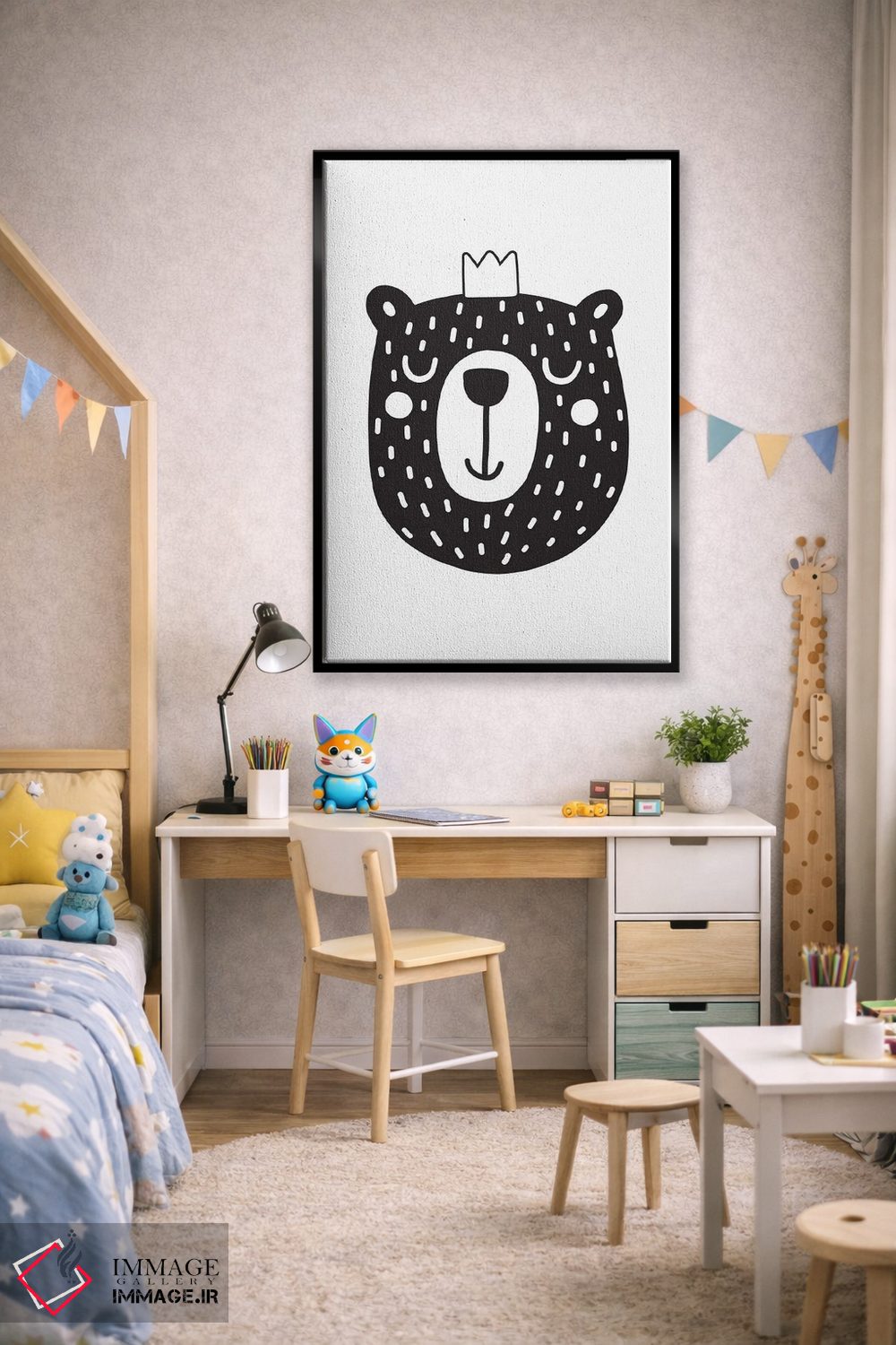 برای اتاقی که به یک عنصر دوستداشتنی نیاز دارد، «توله خرس» اثرِ «نیکول باسک» فضا را صمیمیتر و دعوتکنندهتر نشان میدهد؛ برای فضاهای روستیک یا بوهو انتخابی خوشسلیقه است. به دیوار، قصه میدهد—اما قصهای آرام و شیک.