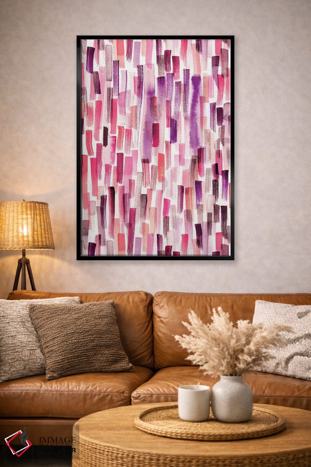 «حرکت قلم آبرنگی مرجانی و بنفش» اثرِ «نینولا دیزاین (استودیو طراحی)» اگر دنبال اثر انتزاعیِ قابلچیدمان هستید که فضا را سنگین نکند، گزینهی خوبیست.