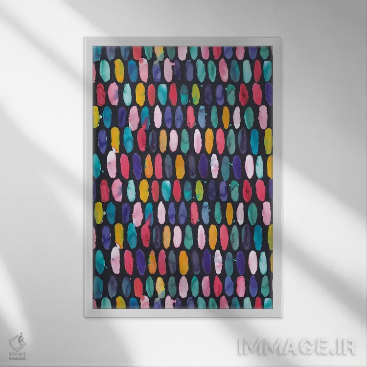 تابلو دکوراتیو قرص های دایره ای چندرنگ و سورمه ای اثر نینولا دیزاین - نمای قاب‌دار سفید