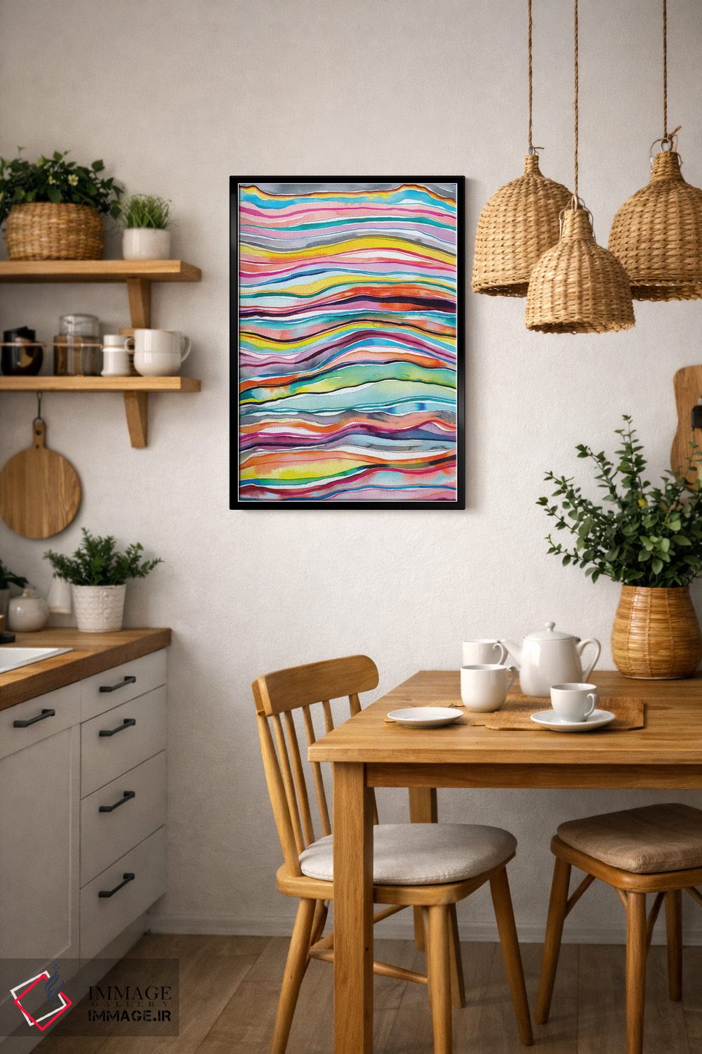 براساس پالت ترکیبی اثر، قاب تیک گرم (چوبی) پیشنهاد اول است و مشکی مات (فریم متوسط) مکمل. برای سفارشهای پروژهای با ابعاد و قابهای اختصاصی با ایماژ در تماس باشید.