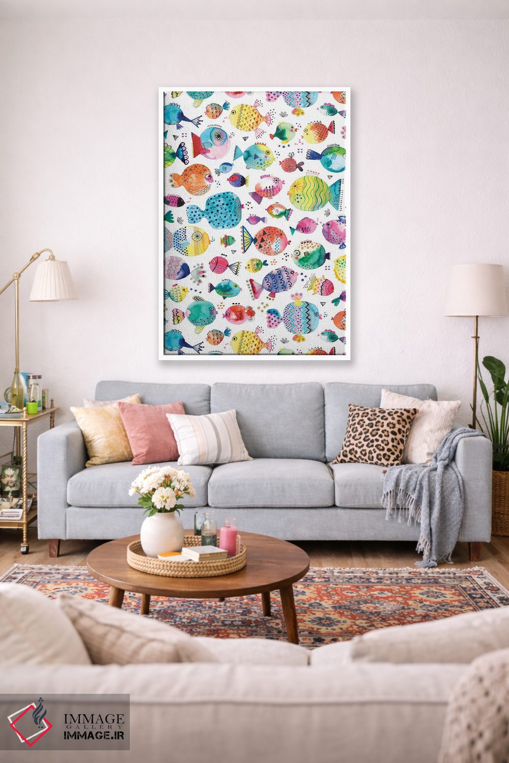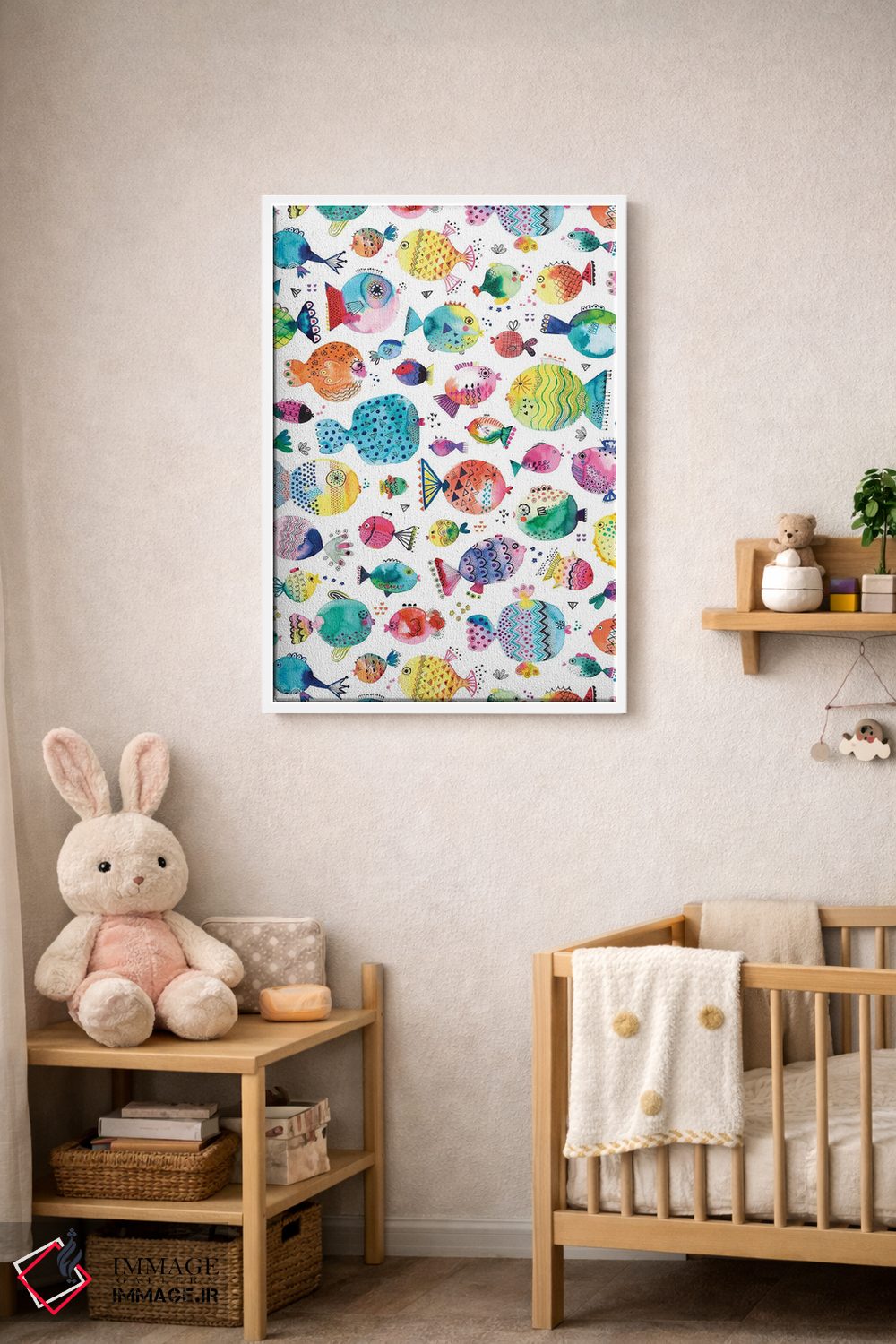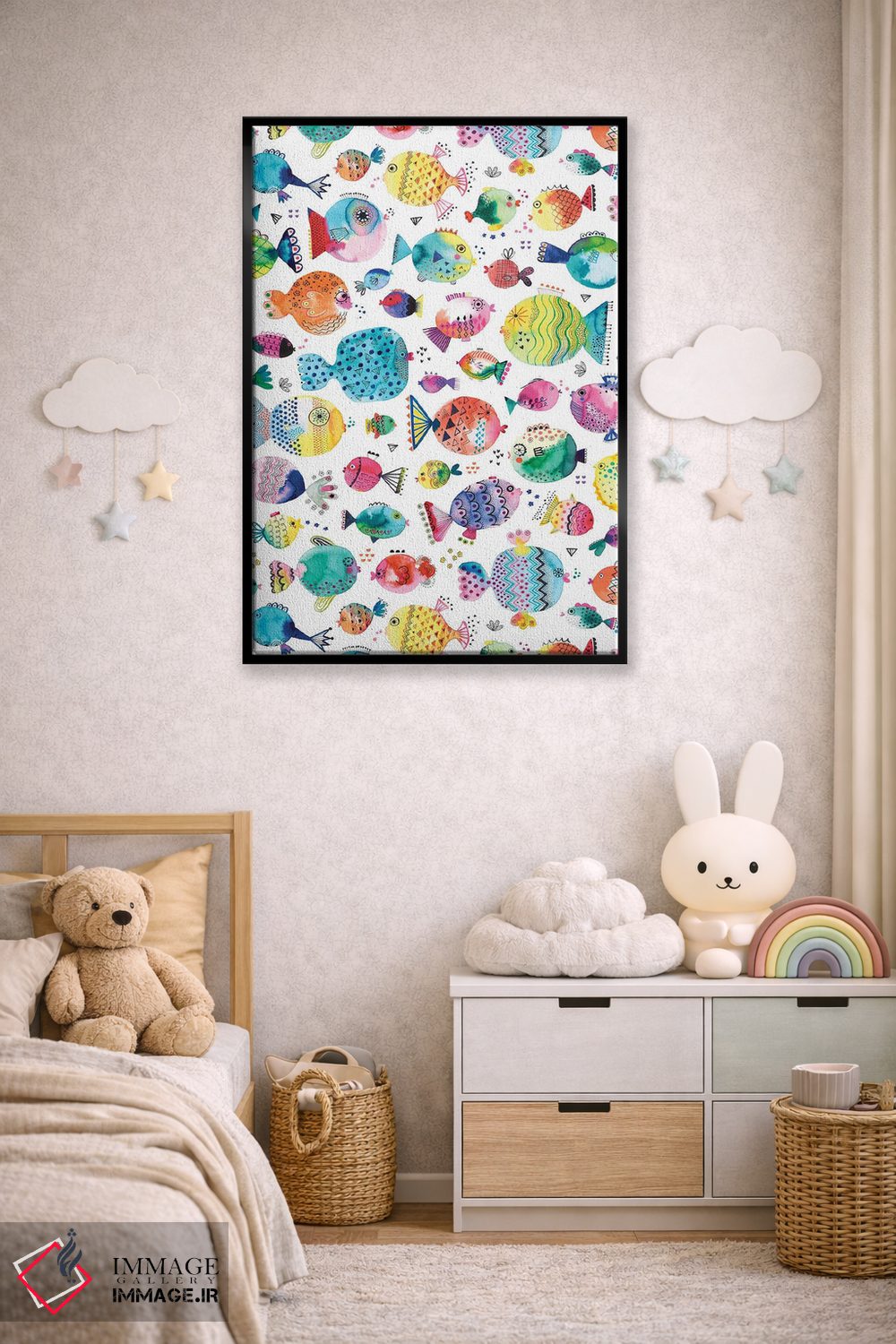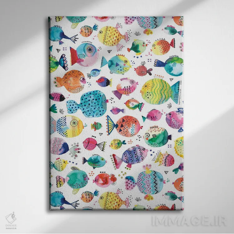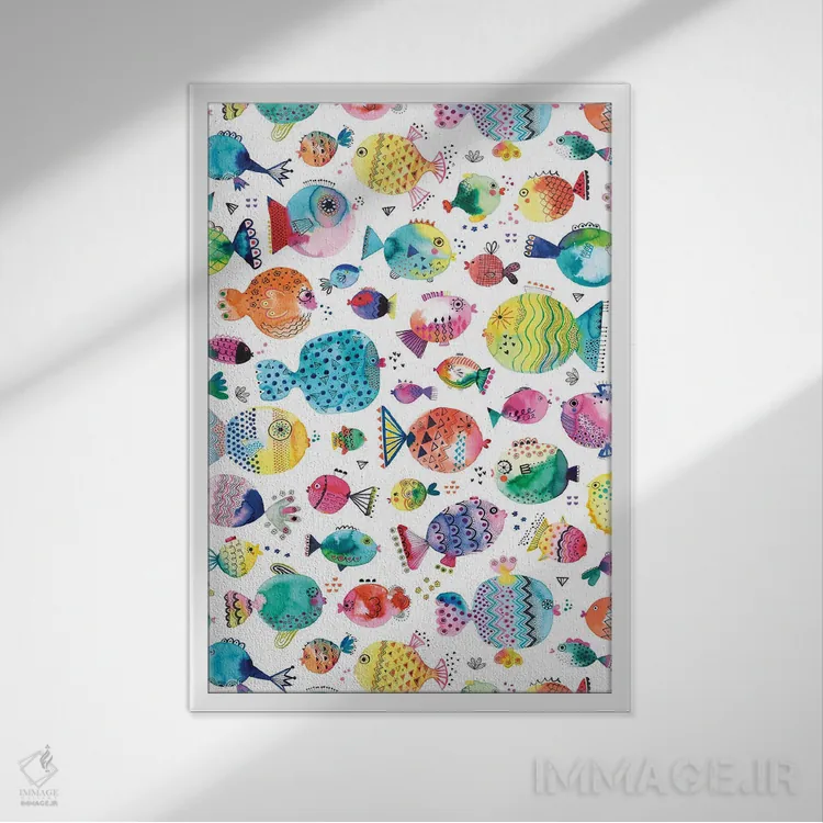 «ماهیهای بادکنکی بامزه با آبرنگ چندرنگ» اثرِ «نینولا دیزاین (استودیو طراحی)» از آن کارهاییست که هم چشم را میگیرد، هم با چیدمانهای مختلف راحت ست میشود—بهخصوص در تم این اثر.