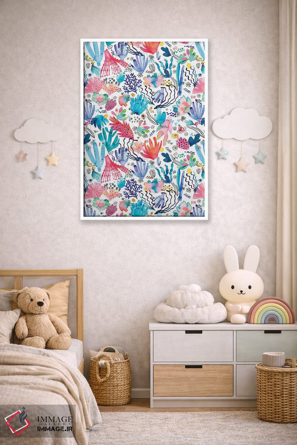 «صخرهٔ مرجانی آبرنگی چندرنگ» اثرِ «نینولا دیزاین (استودیو طراحی)» از آن کارهاییست که فضا را صمیمیتر و دعوتکنندهتر نشان میدهد؛ برای اتاق بازی یا گوشهٔ مطالعه انتخاب خوبیست. حسش صمیمی است، اما کیفیتش جدی و خوشپرداخت.
