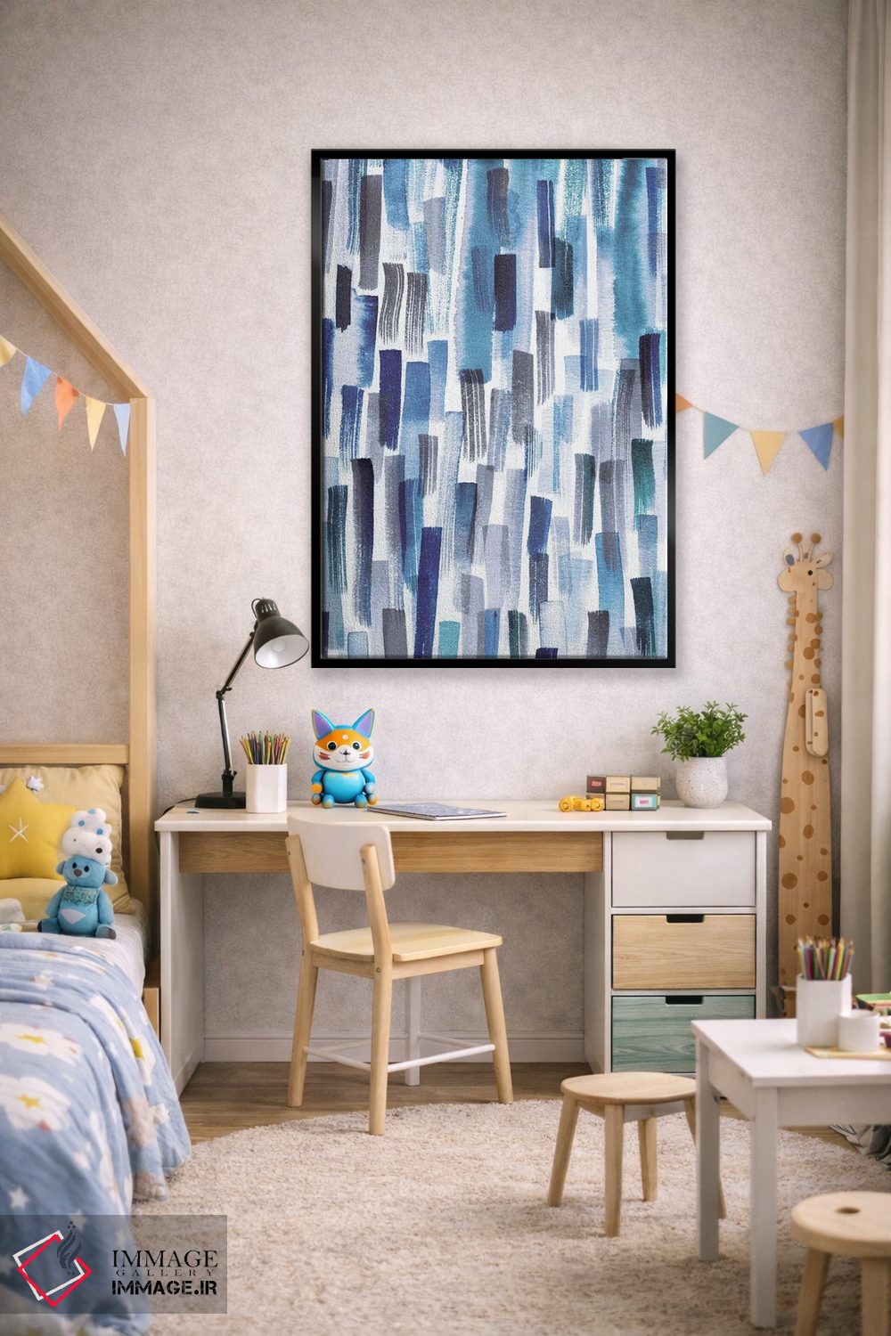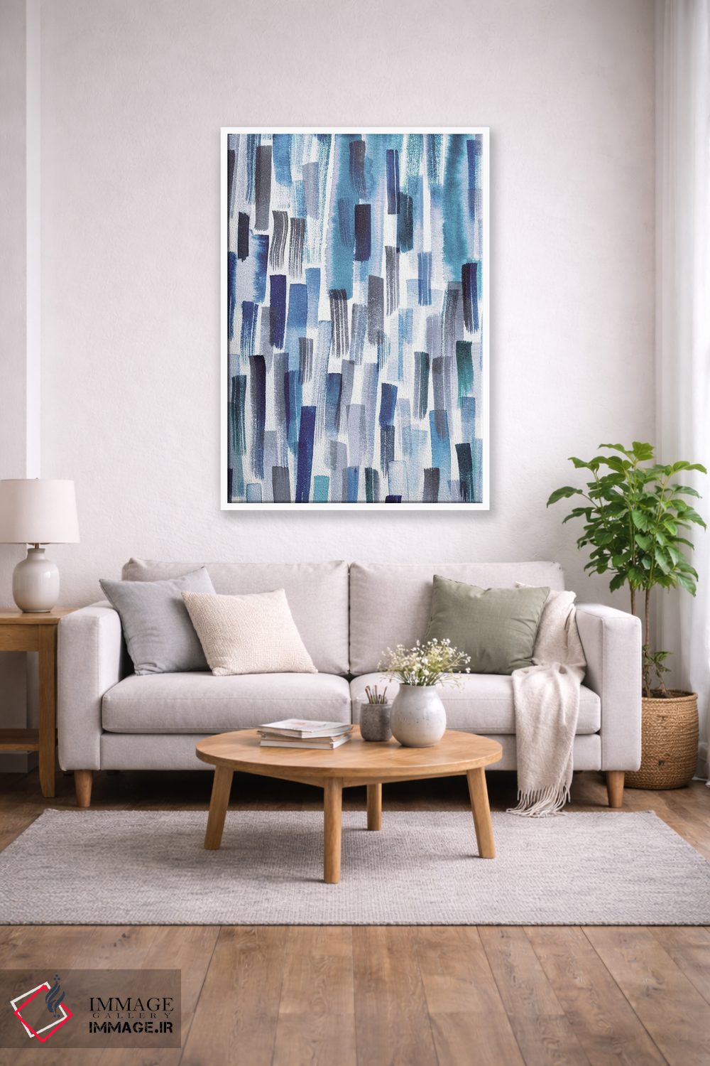 برای اینکه پالت جمع شود، آبی را در فرش یا پرده (بهصورت خیلی کم) دوباره بیاورید تا نگاه به سمت اثر هدایت شود. اگر فضا شلوغ است، فقط یک نقطهٔ رنگی بس است.