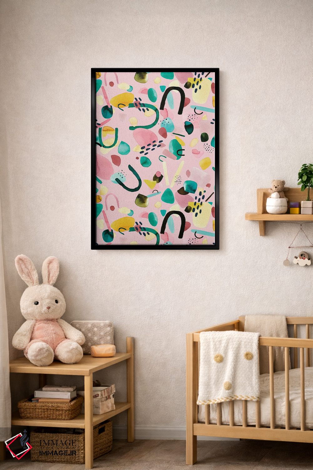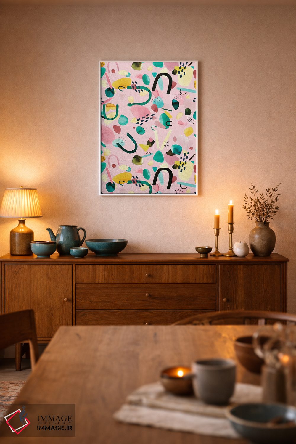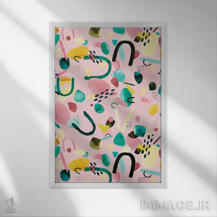 «قطعات هندسی انتزاعی صورتی و سبز» اثرِ «نینولا دیزاین (استودیو طراحی)» یک پیشنهاد حرفهای برای اتاق کار یا نشیمنهای مدرن است؛ چون هم انرژی دارد هم کنترلشده است.