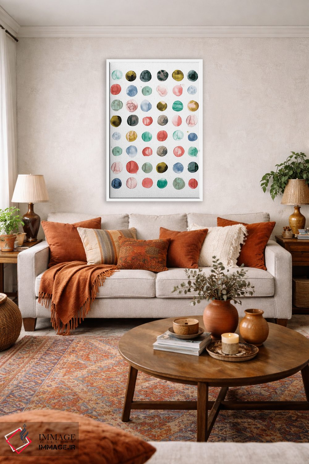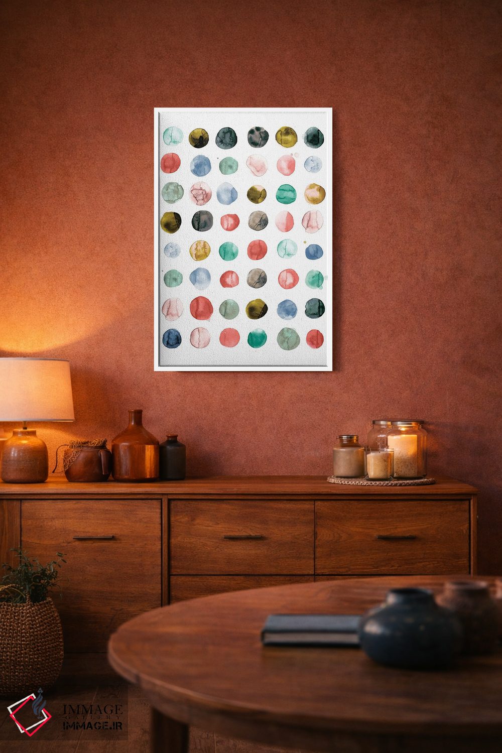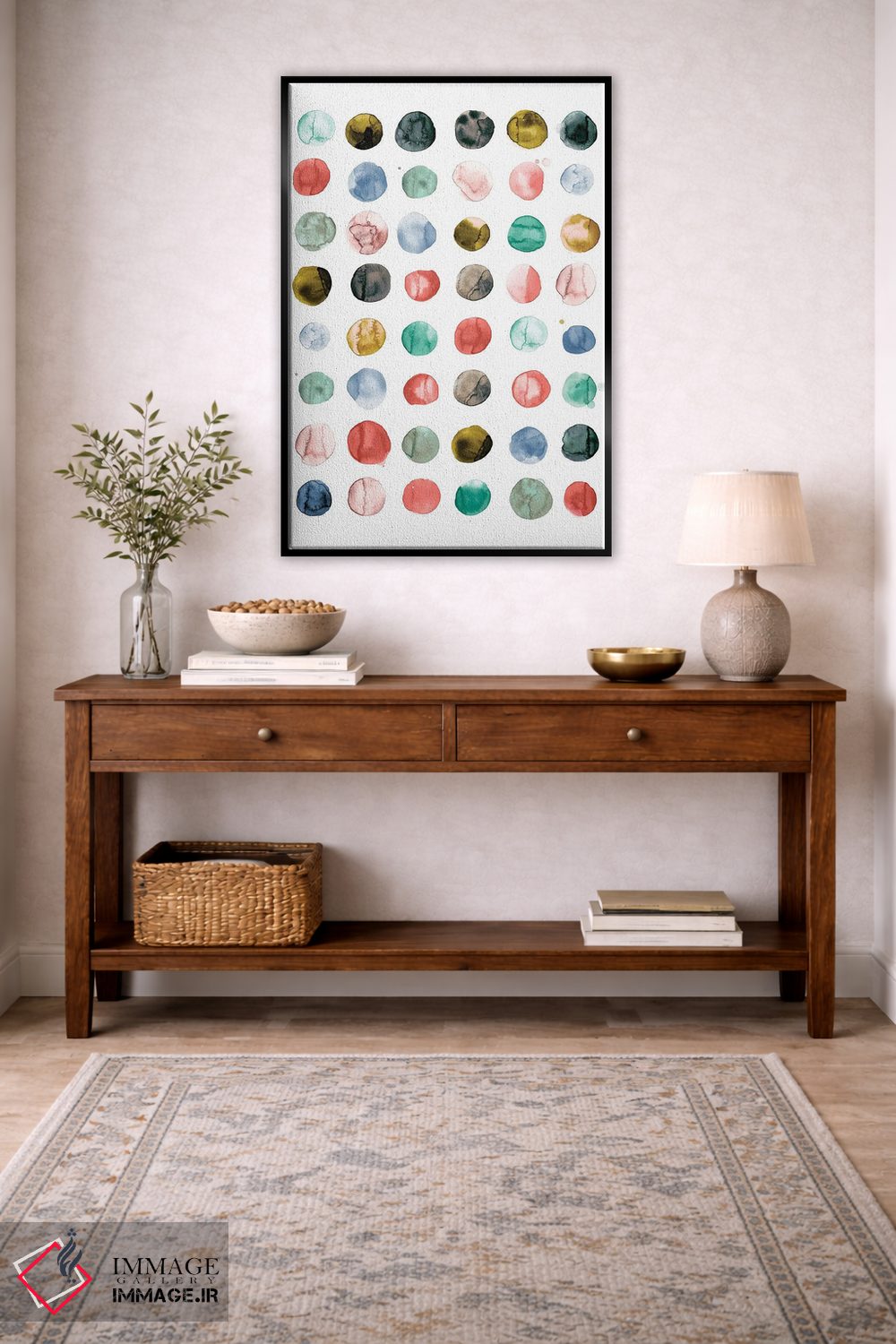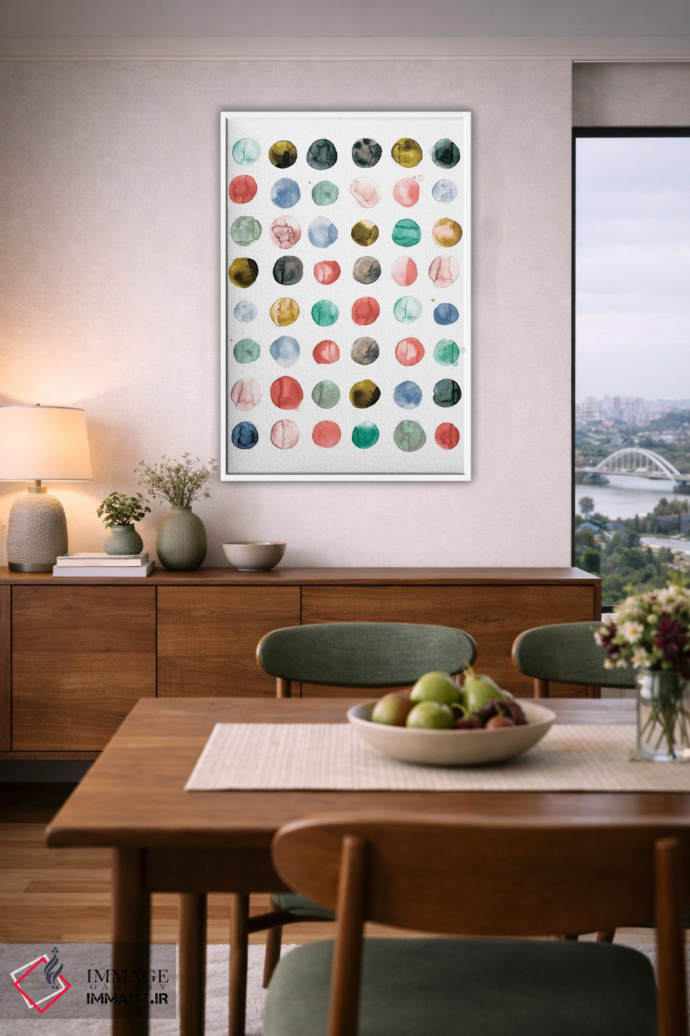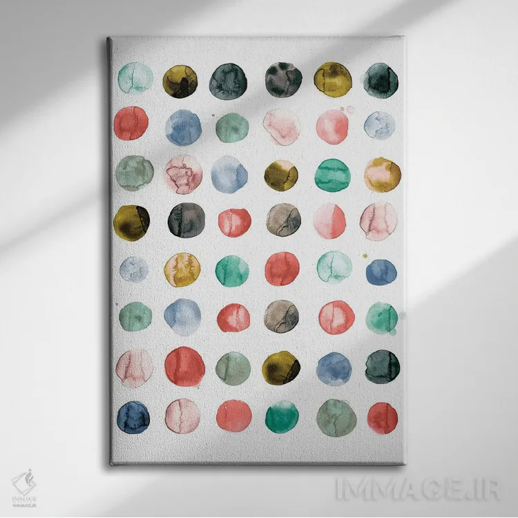 در «دایرههای آبرنگی به رنگ مرجانی و سبز» اثرِ «نینولا دیزاین (استودیو طراحی)»، ریتم بصری به چشم میآید؛ مناسب برای دیوار شاخص کنار مبلمان ساده.