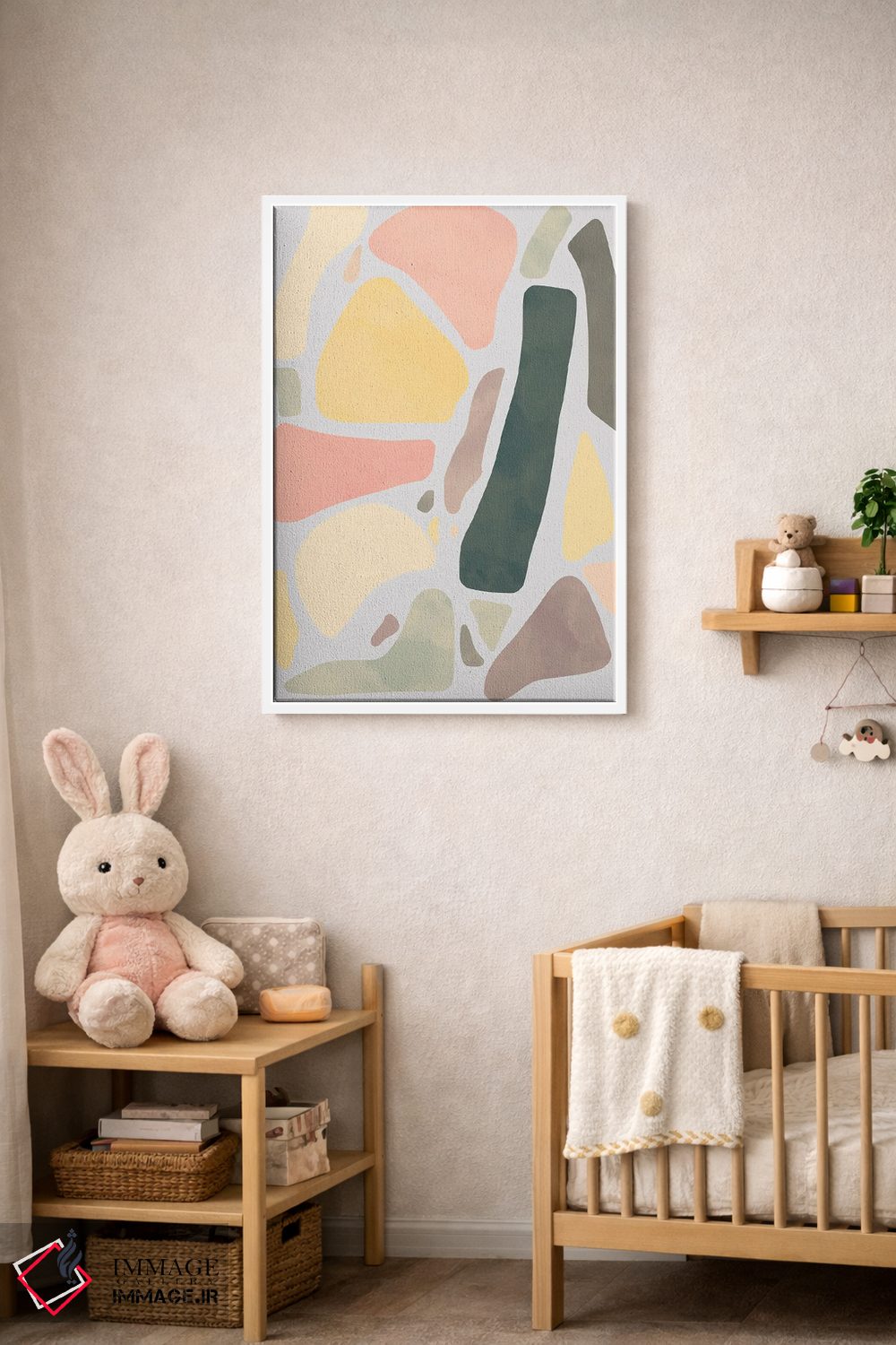 براساس پالت گرم اثر، قاب بلوط روشن (چوبی) پیشنهاد اول است و استخوانی ملایم مکمل. برای سفارشهای پروژهای با ابعاد و قابهای اختصاصی با ایماژ در تماس باشید.