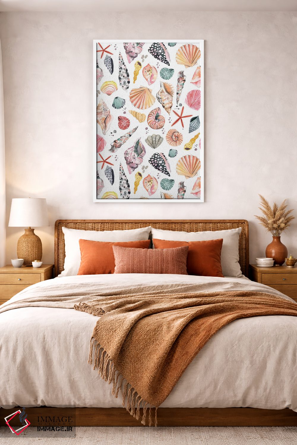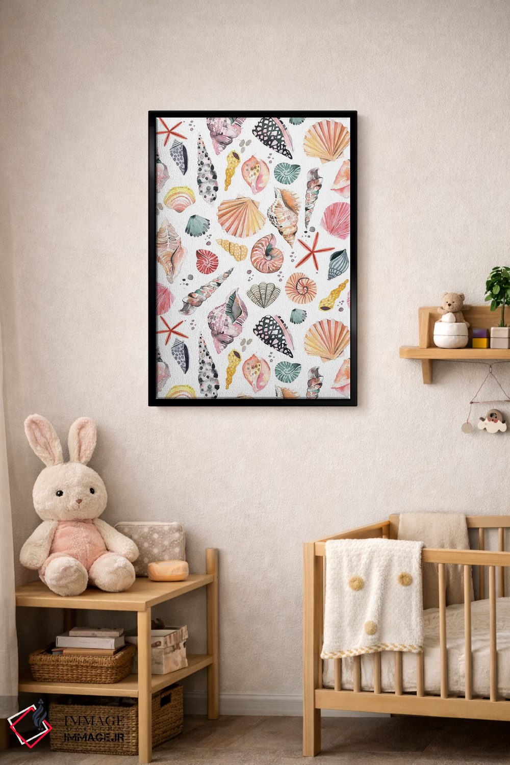 «صدفهای دریایی و شن ساحلی» اثرِ «نینولا دیزاین (استودیو طراحی)» از آن کارهاییست که به دیوار، انرژیِ نرم و زنده میدهد؛ برای اتاق کودک (بدون لحن کودکانه) انتخاب خوبیست. برای دیوار گالریوار هم گزینهٔ خوبیست.