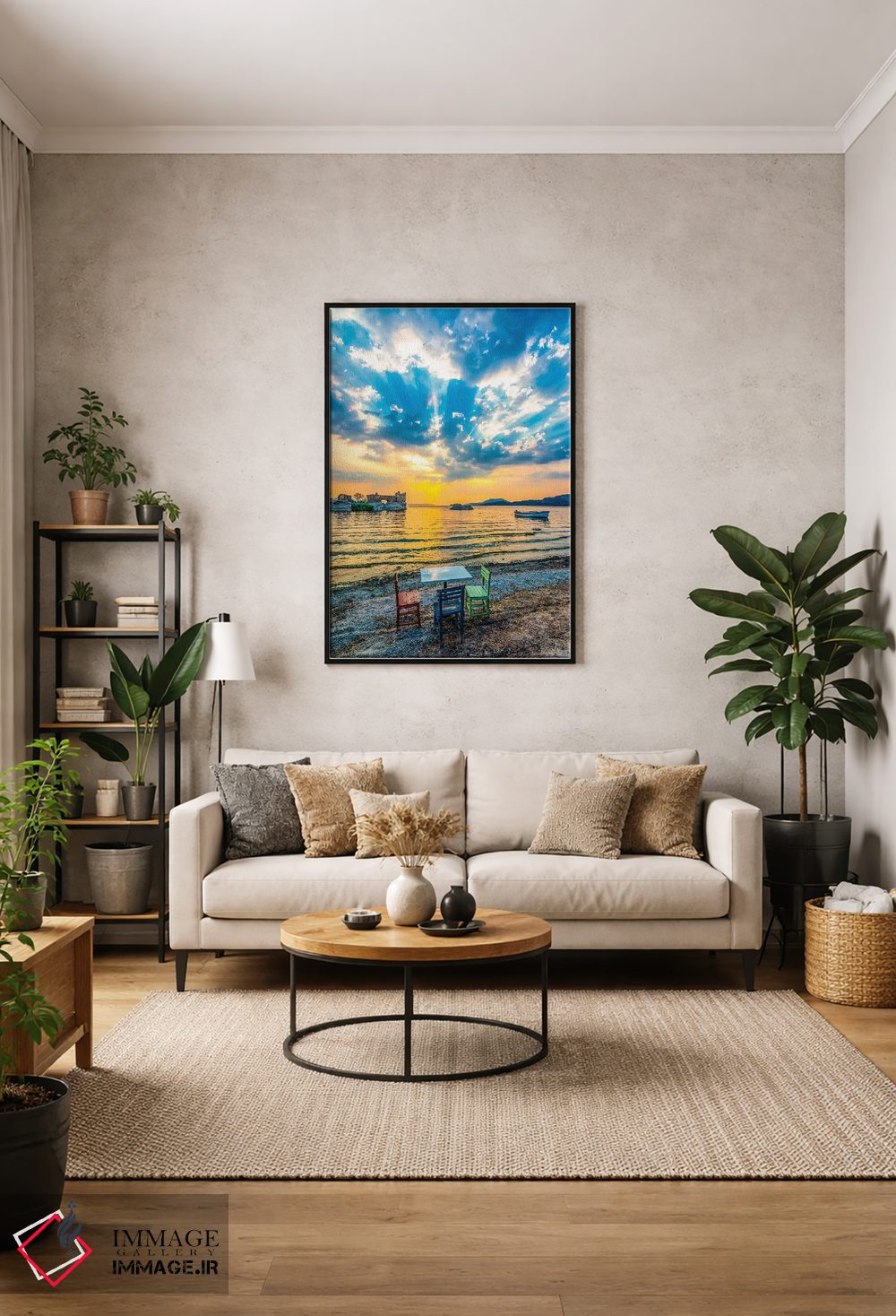 براساس پالت ترکیبی اثر، قاب تیک گرم (چوبی) پیشنهاد اول است و مشکی مات (فریم متوسط) مکمل. برای سفارشهای پروژهای با ابعاد و قابهای اختصاصی با ایماژ در تماس باشید.