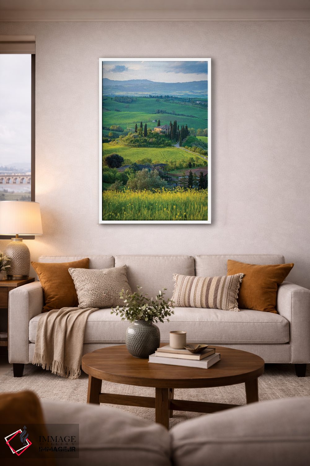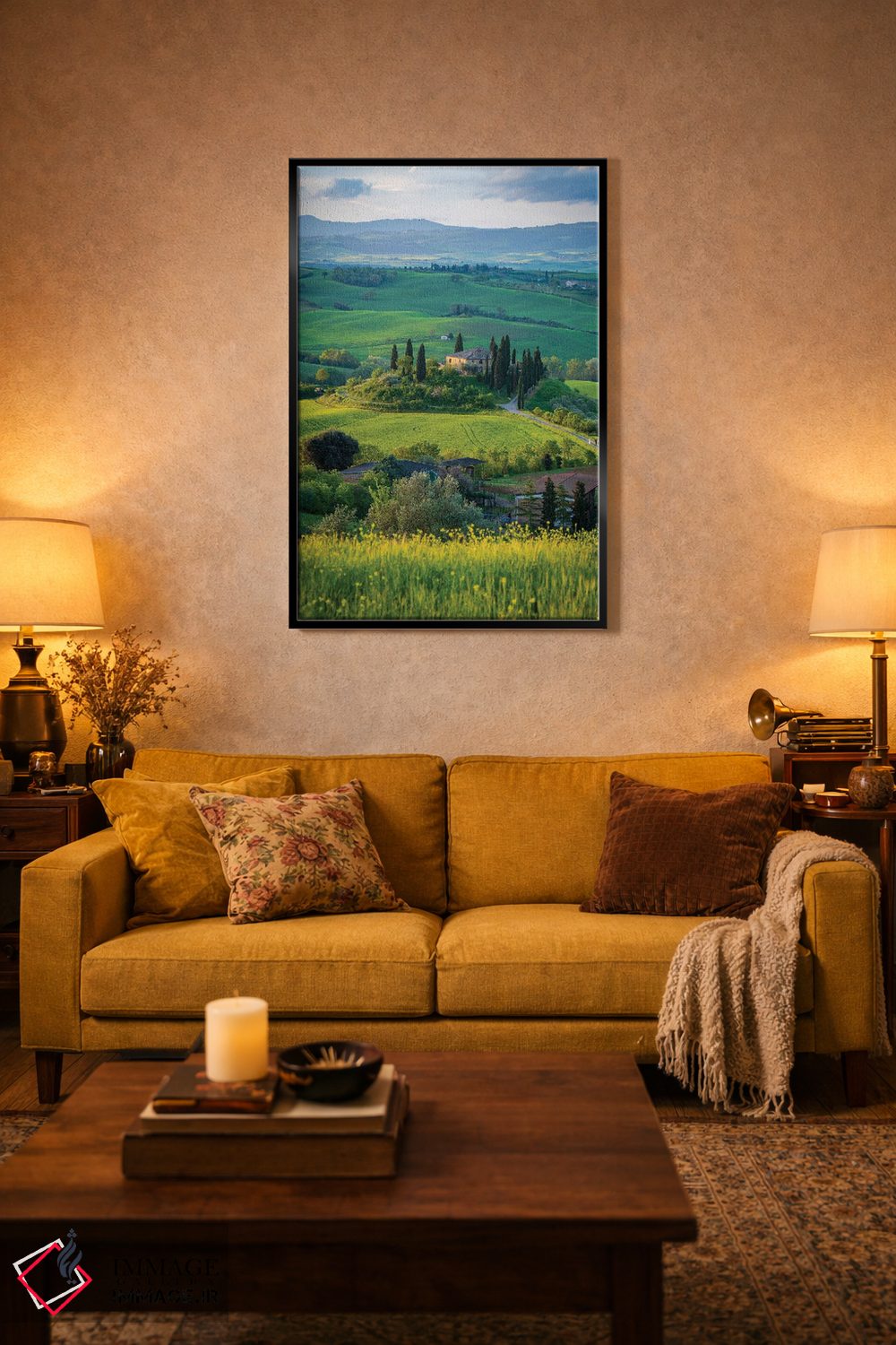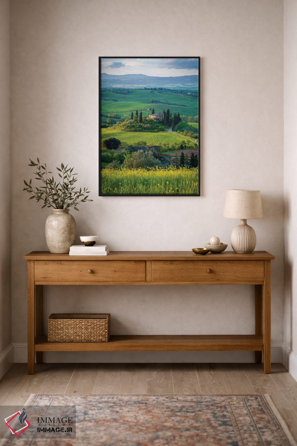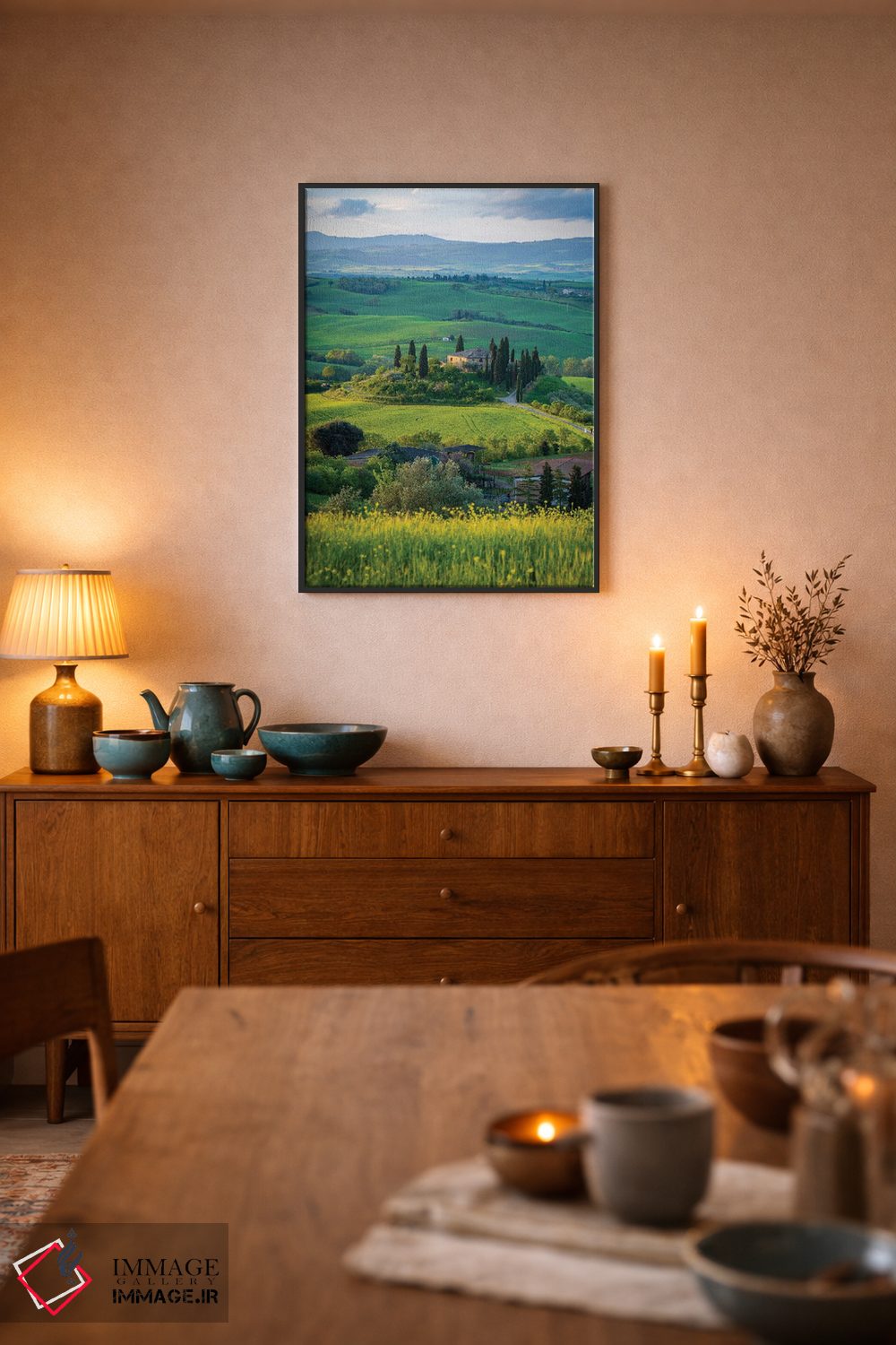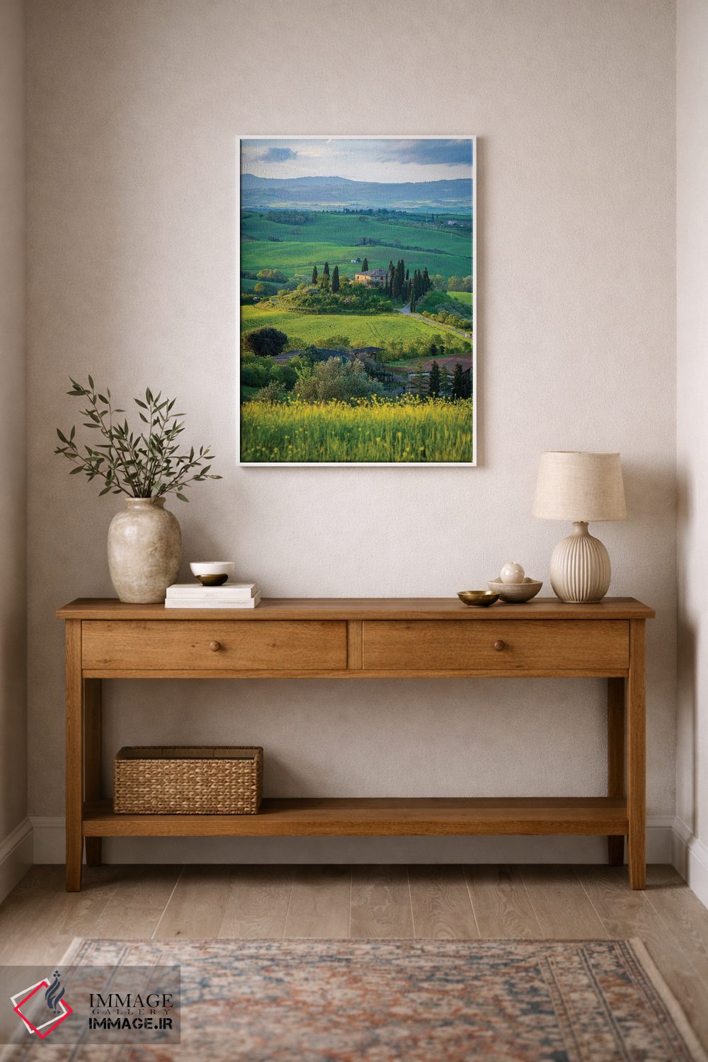 اگر میخواهید دیوار از «پسزمینه» بیرون بیاید، «منظره توسکانی IV (ایتالیا)» اثرِ «نجدت دوزن» جلوهٔ رنگها را طبیعیتر و متعادلتر نشان میدهد؛ برای فضاهای کمنور که به «نقطهٔ روشن» نیاز دارند پیشنهاد میشود. به دیوار حس «تمامشده» میدهد.