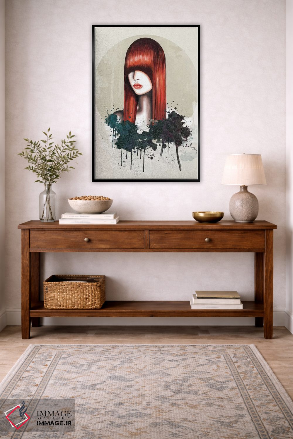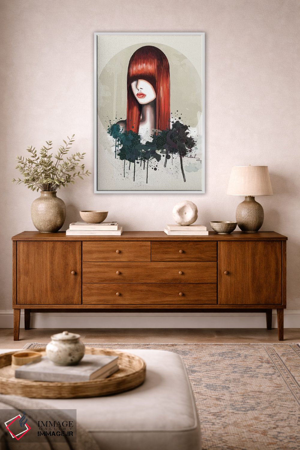 براساس پالت ترکیبی اثر، قاب تیک گرم (چوبی) پیشنهاد اول است و مشکی مات (فریم متوسط) مکمل. برای سفارشهای پروژهای با ابعاد و قابهای اختصاصی با ایماژ در تماس باشید.