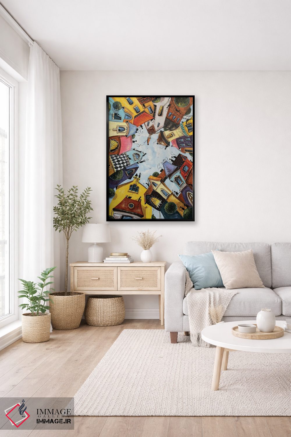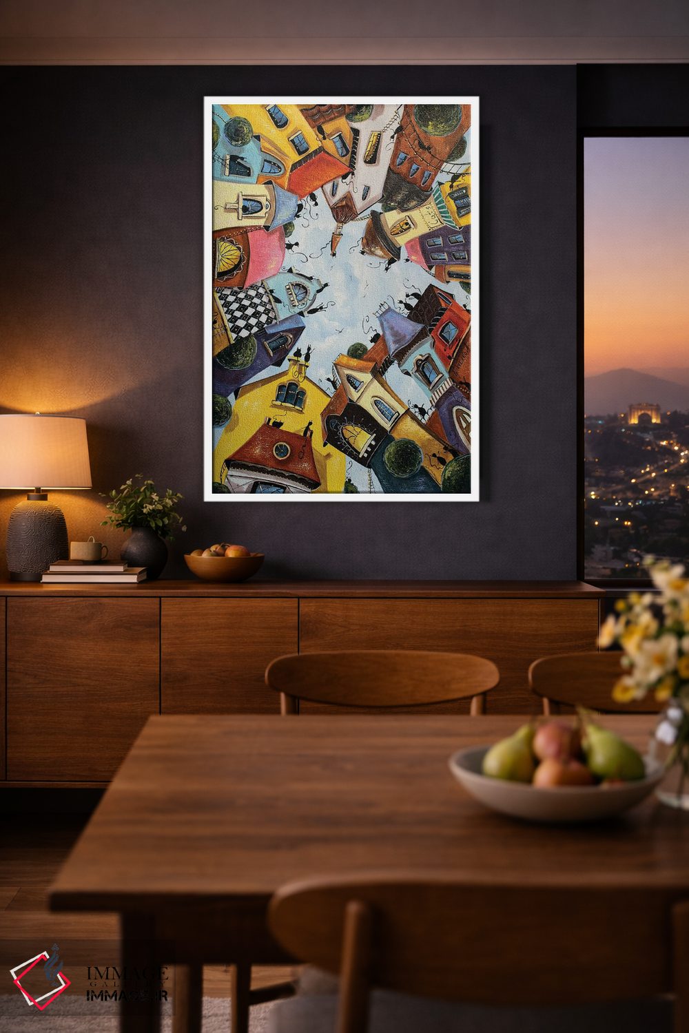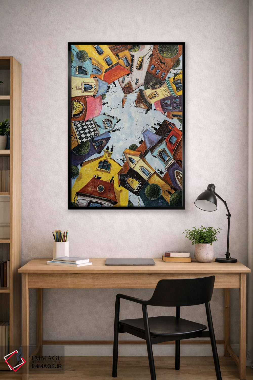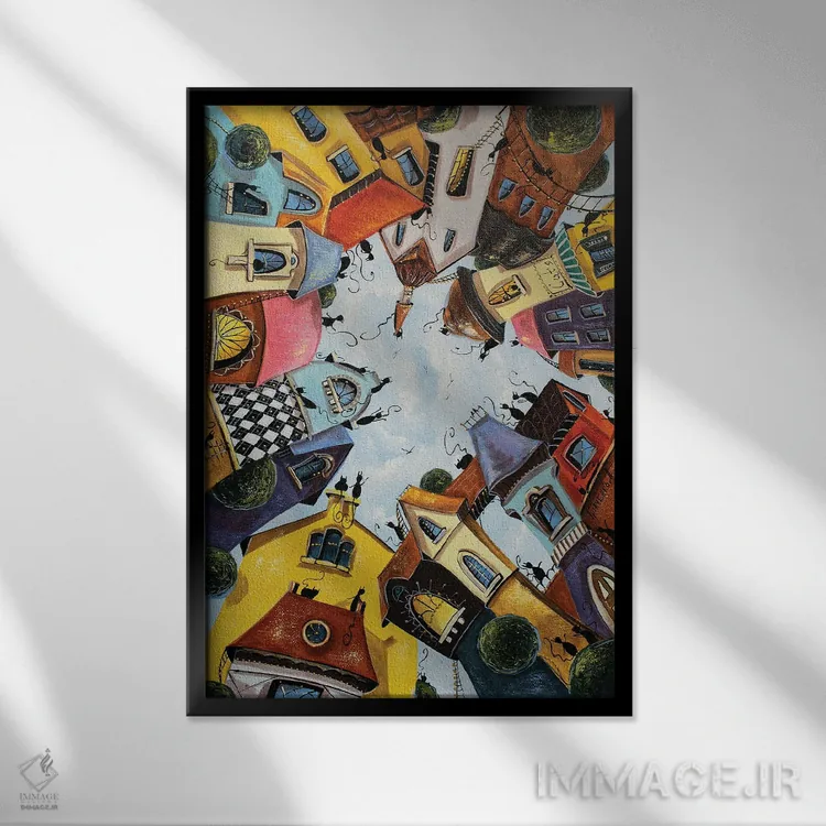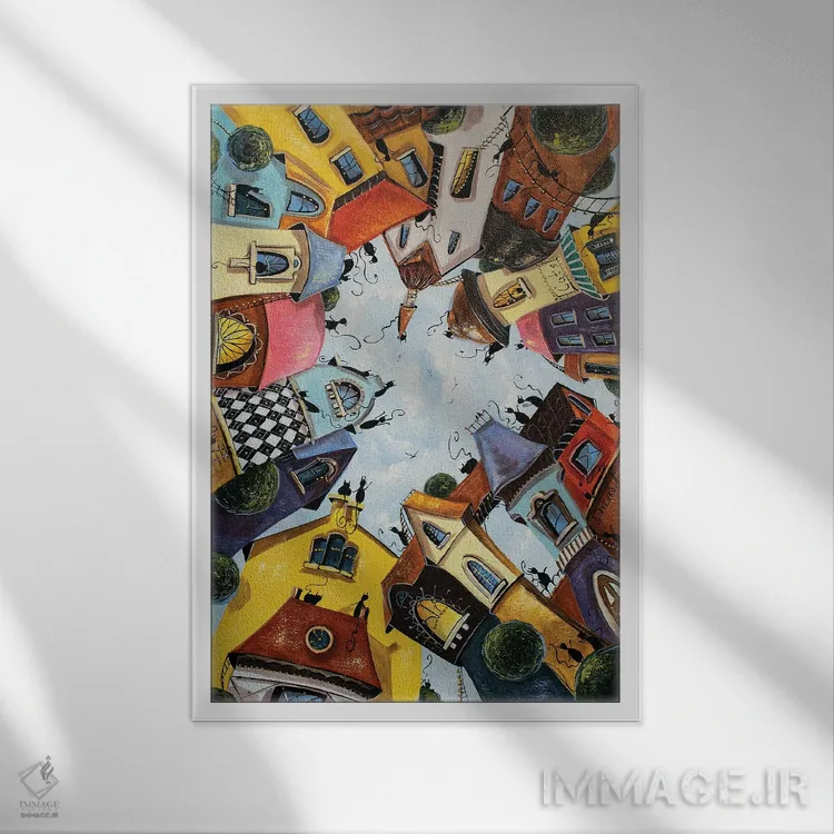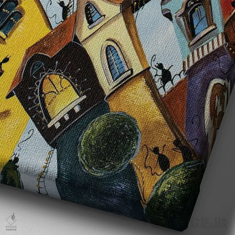تابلو دکوراتیو خانه های رنگارنگ در شهر گربه ها اثر ناتالیا گرینچنکو