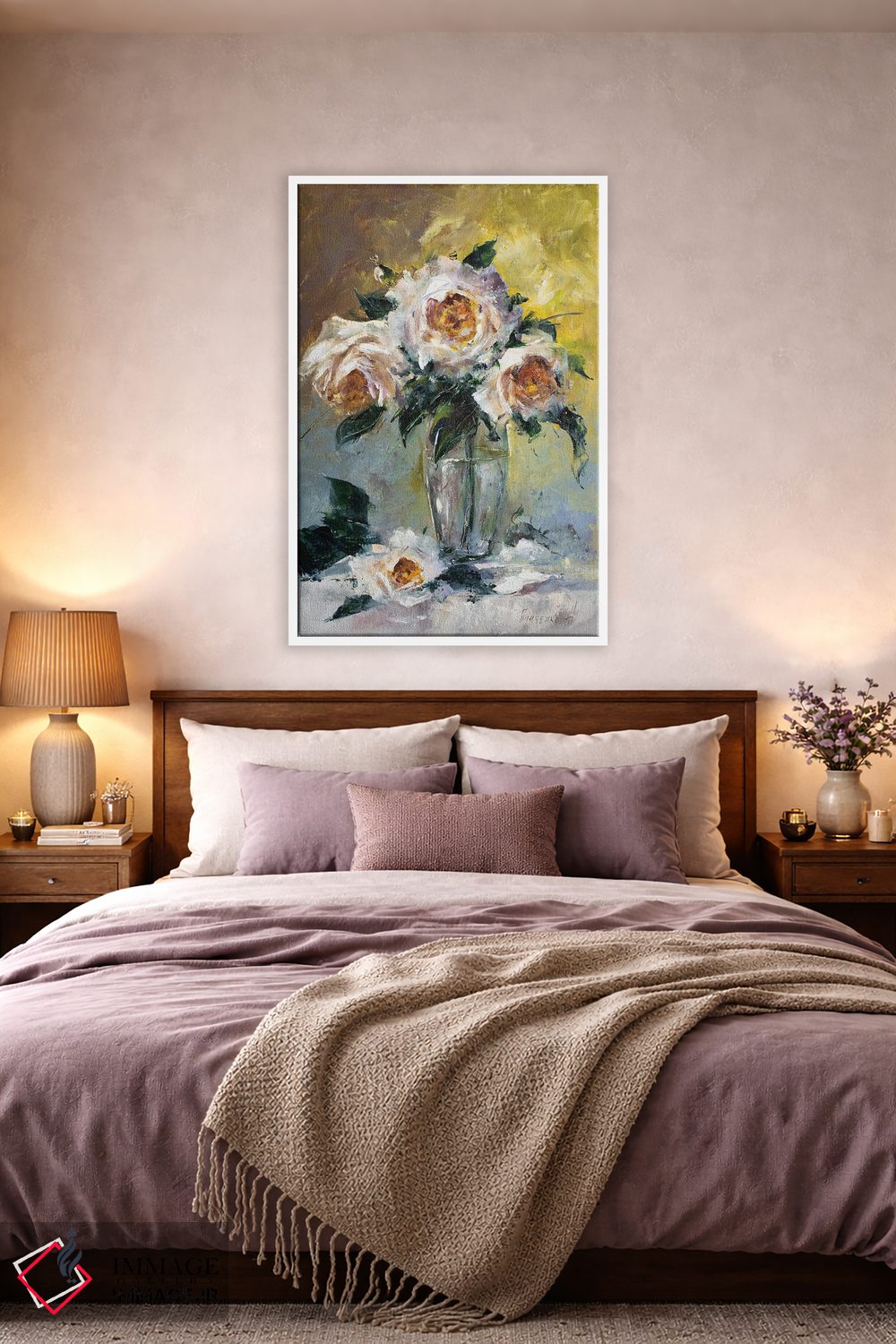 اگر به دکورهای طبیعی علاقه دارید، «دسته گل رز سفید» اثرِ «ناتالیا گرینچنکو» به دیوار، روشناییِ ملایم و دلنشین میدهد، برای اتاق خواب گزینهٔ مناسبیست. برای دیوار گالری هم ترکیبپذیر و خوشنشین است.