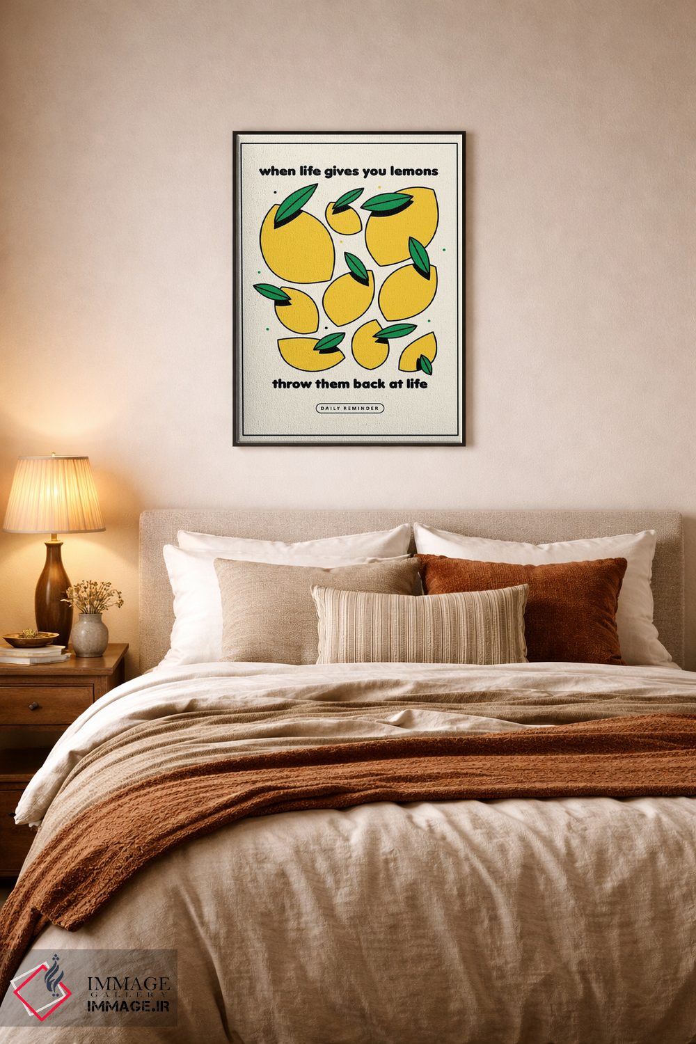 این تابلو با عنوان «وقتی زندگی بهت لیمو میدهد بژ» اثرِ «نورا گازار»، حسِ گرم و صمیمی به فضا میدهد.
