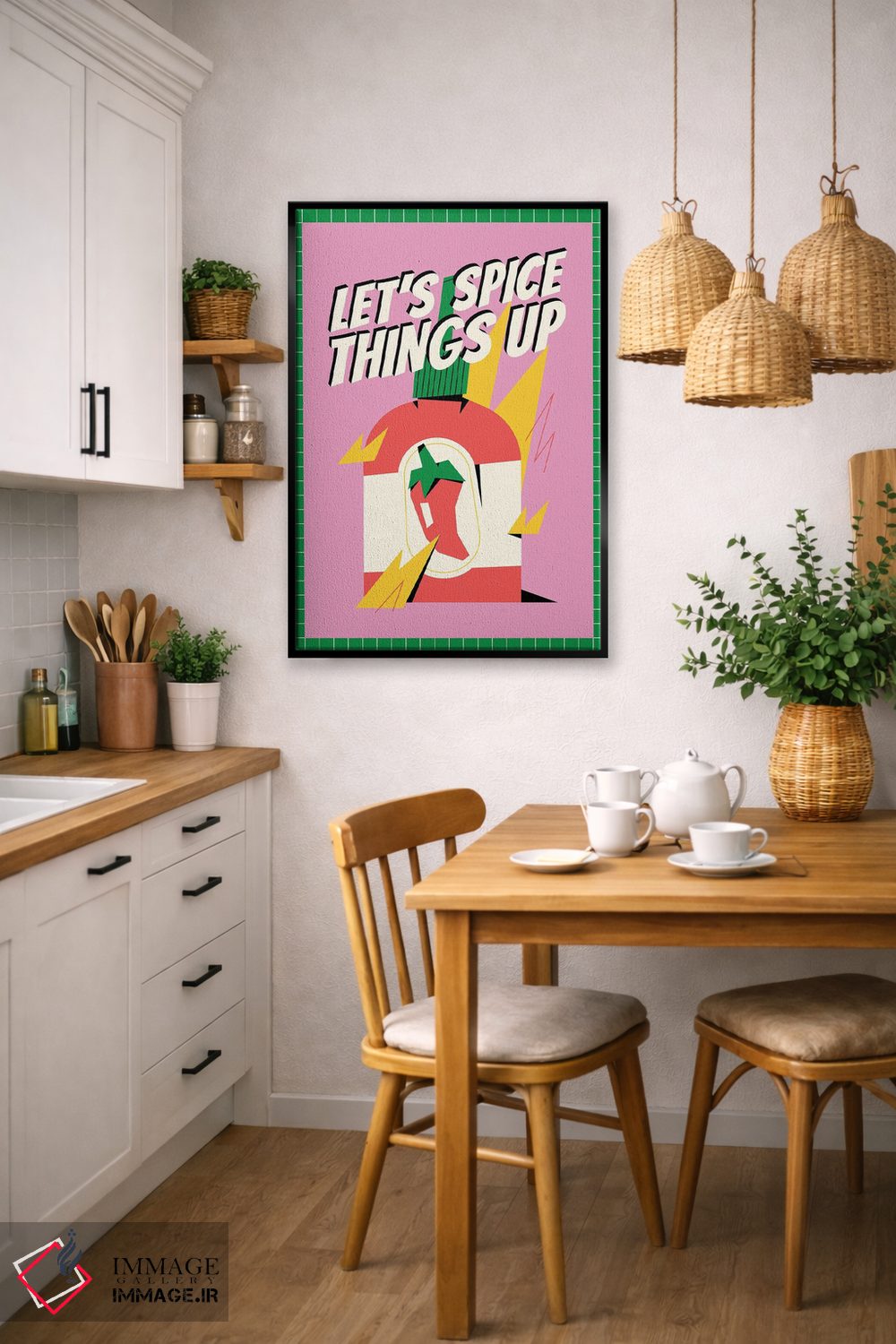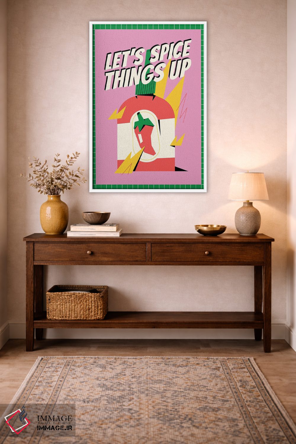 این تابلو با عنوان «بیایید کمی هیجان اضافه کنیم صورتی» اثرِ «نورا گازار»، حسِ گرم و صمیمی به فضا میدهد.