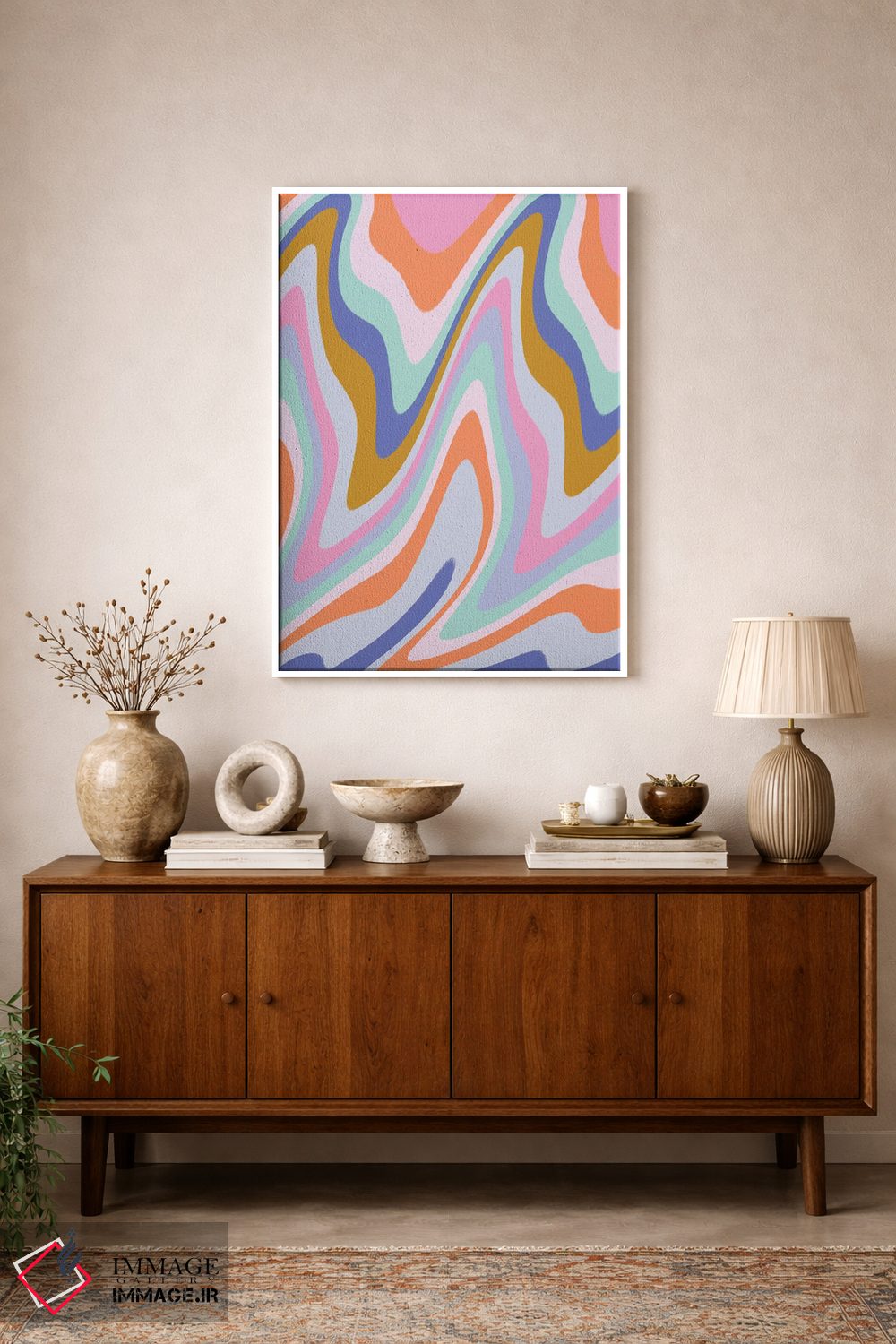 براساس پالت ترکیبی اثر، قاب تیک گرم (چوبی) پیشنهاد اول است و مشکی مات (فریم متوسط) مکمل. برای سفارشهای پروژهای با ابعاد و قابهای اختصاصی با ایماژ در تماس باشید.