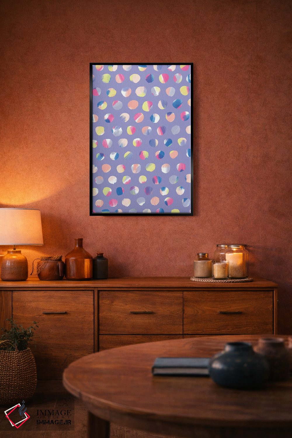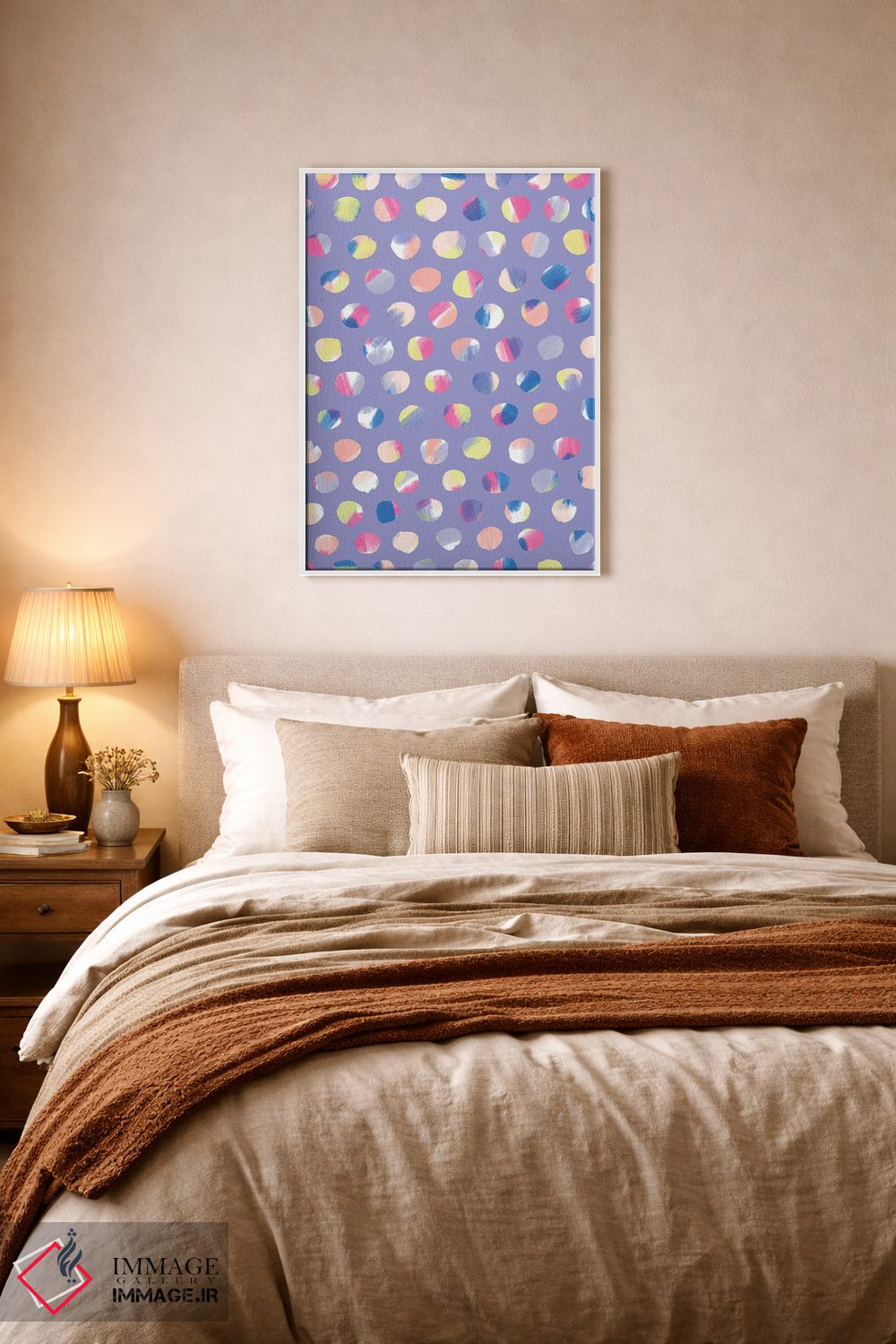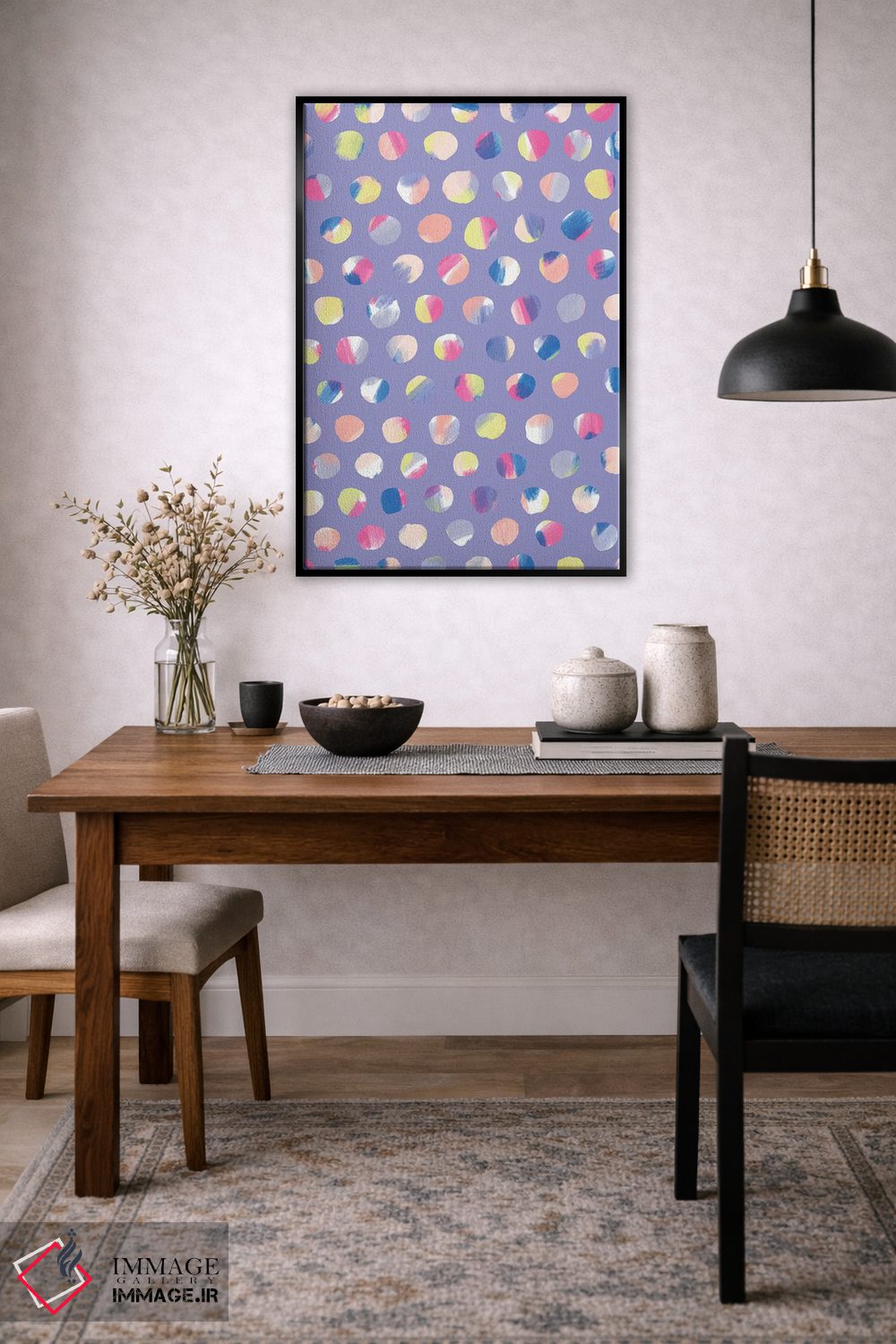 تابلو انتزاعی نقطه های نقاشی شده اثر نادیا حسن - نمای روبه‌رو روی دیوار