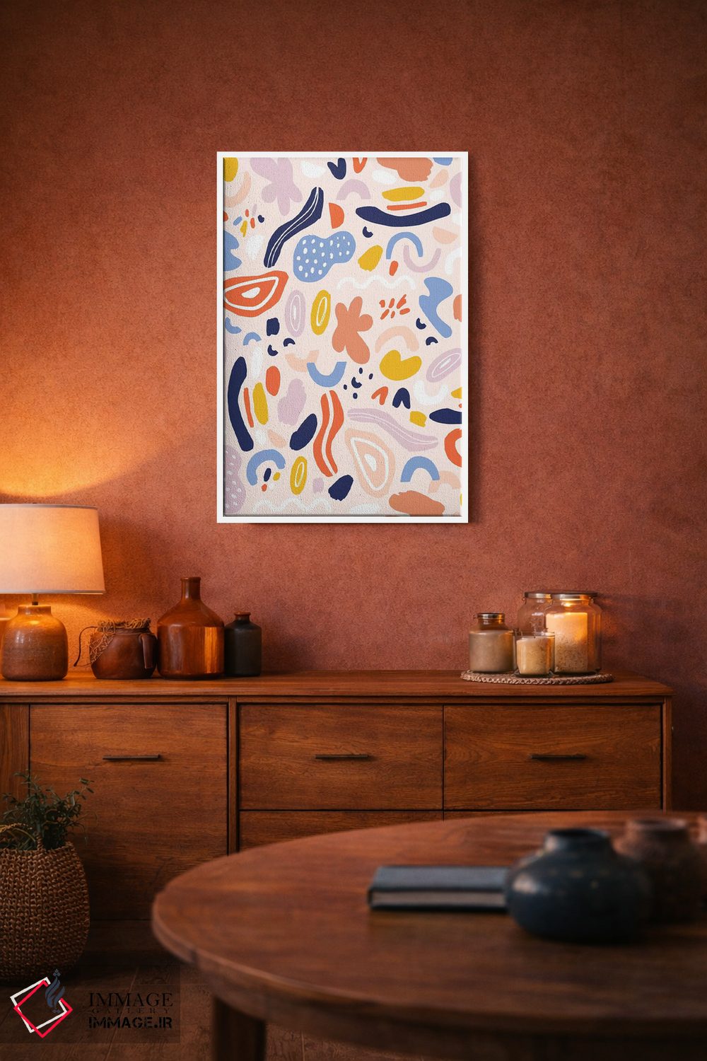 براساس پالت ترکیبی اثر، قاب تیک گرم (چوبی) پیشنهاد اول است و مشکی مات (فریم متوسط) مکمل. برای سفارشهای پروژهای با ابعاد و قابهای اختصاصی با ایماژ در تماس باشید.