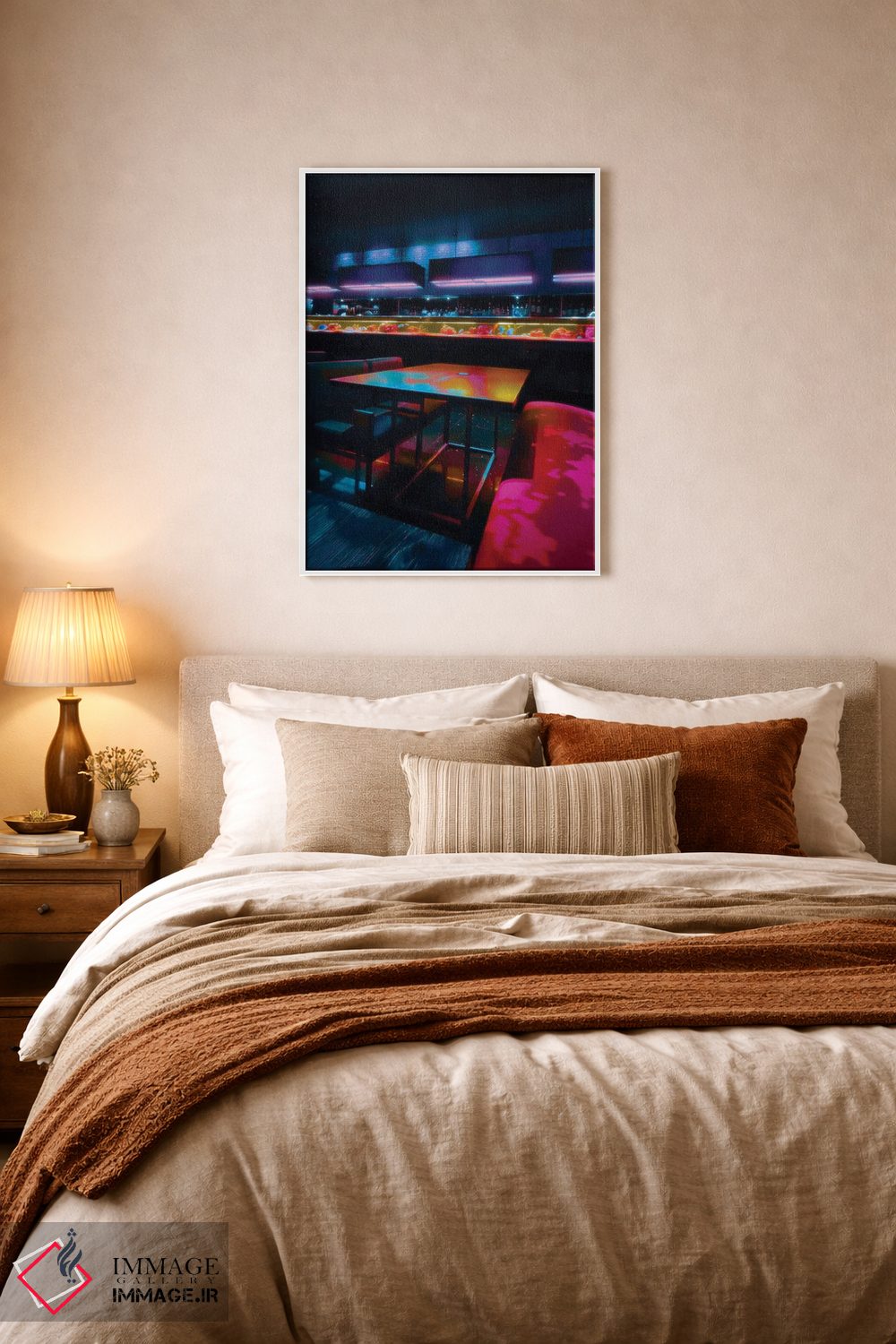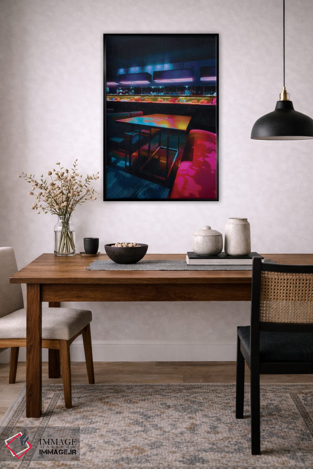 ساختار بوم گالری ایماژ طوری است که اثر روی دیوار «پرداختشده» و حرفهای دیده شود—نه پرزرقوبرقِ بیپایه؛ بلکه دقیق و خوشپرداخت. بافت ظریف کنواس باعث میشود حس اثر هنری را در نگاه نزدیک نگه میدارد. با کنترل تونها، کمک میکند رنگها روی دیوار واقعیتر بنشینند و در چیدمانهای مدرن و کمینهگرا خیلی خوب مینشیند. حاصل کار، یک تابلو خوشنشین است که هم از دور اثرگذار است و هم از نزدیک خوشخوان؛ و اگر بخواهید، میتوان چیدمان را برای گالریوال هم پیشنهاد داد. در کنار چوب و متریالهای طبیعی، بافت کنواس دلنشینتر دیده میشود.