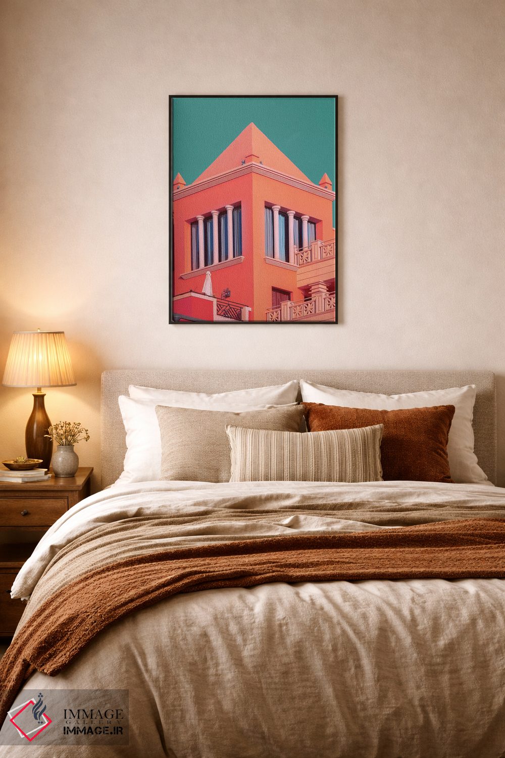 براساس پالت ترکیبی اثر، قاب تیک گرم (چوبی) پیشنهاد اول است و مشکی مات (فریم متوسط) مکمل. برای سفارشهای پروژهای با ابعاد و قابهای اختصاصی با ایماژ در تماس باشید.