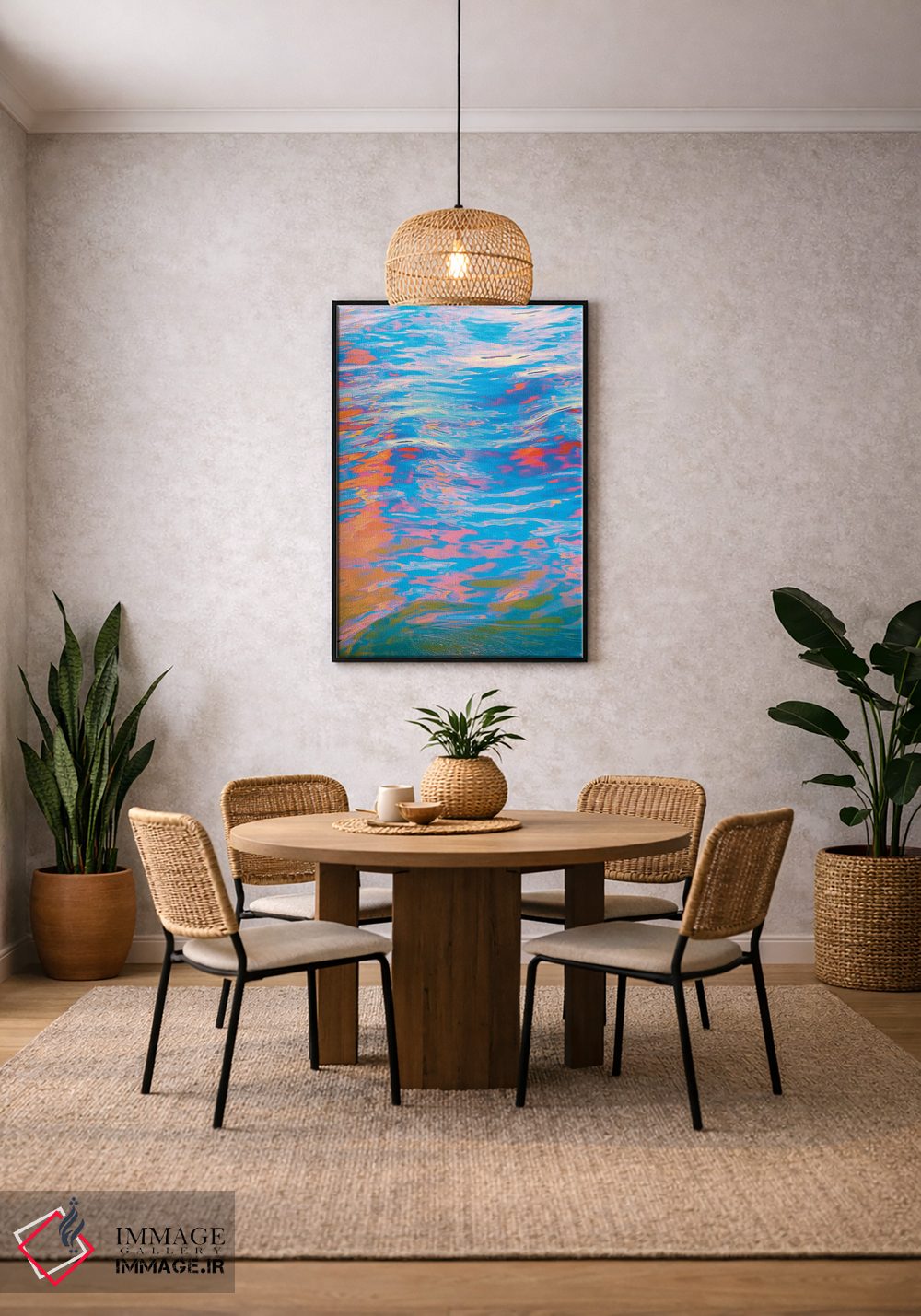 در بوم گالری ایماژ، همهچیز طوری طراحی شده که اثر روی دیوار «پرداختشده» و حرفهای دیده شود—نه پرزرقوبرقِ بیپایه؛ بلکه دقیق و خوشپرداخت. بافت ظریف کنواس باعث میشود حس اثر هنری را در نگاه نزدیک نگه میدارد بدون اغراق؛ فقط دقیقتر. در قابپذیری، میتواند اثر را نقطهٔ کانونی محیط کند بهخصوص وقتی نور موضعی ملایم داشته باشید. حاصل کار، یک تابلو خوشنشین است که هم از دور اثرگذار است و هم از نزدیک خوشخوان؛ اگر فضا کمینهگرا است، همین پرداخت تمیز کافی است.