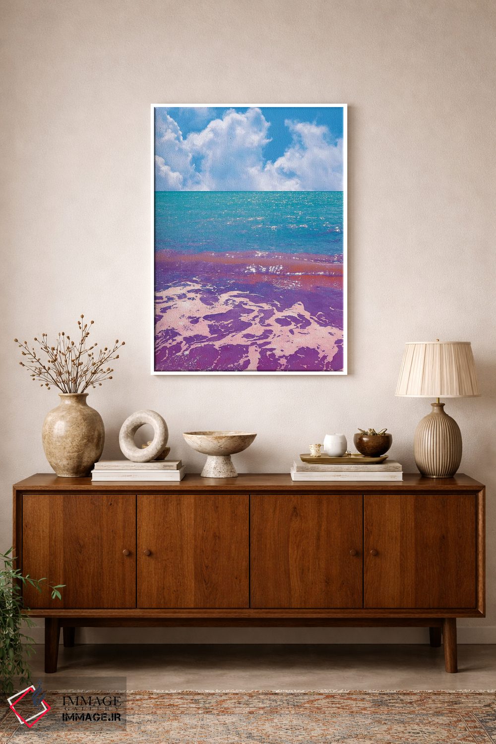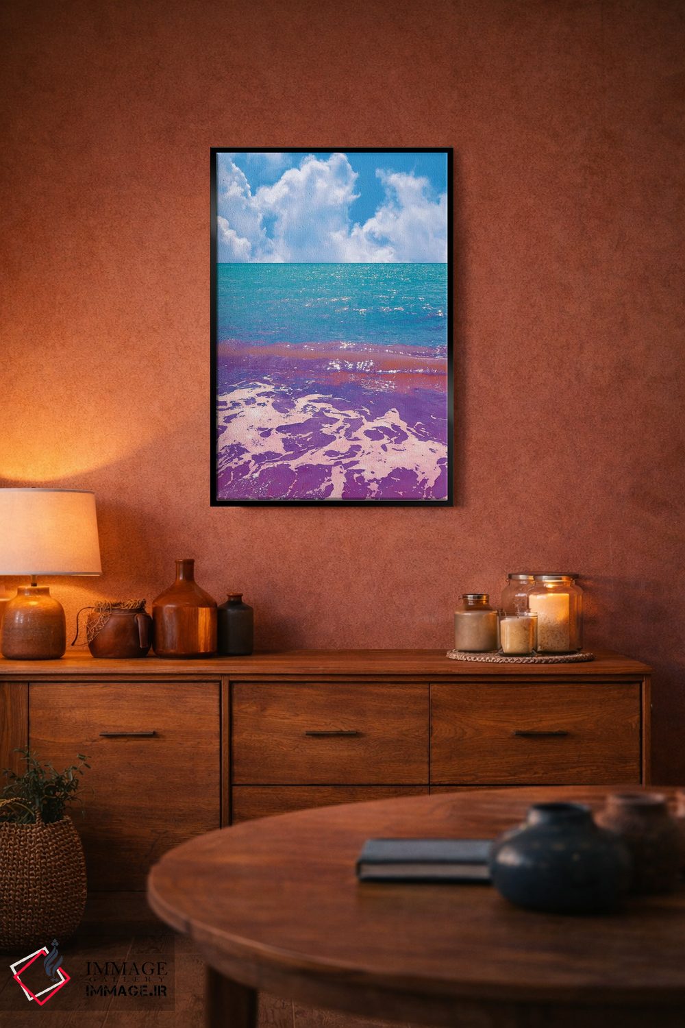 براساس پالت ترکیبی اثر، قاب تیک گرم (چوبی) پیشنهاد اول است و مشکی مات (فریم متوسط) مکمل. برای سفارشهای پروژهای با ابعاد و قابهای اختصاصی با ایماژ در تماس باشید.