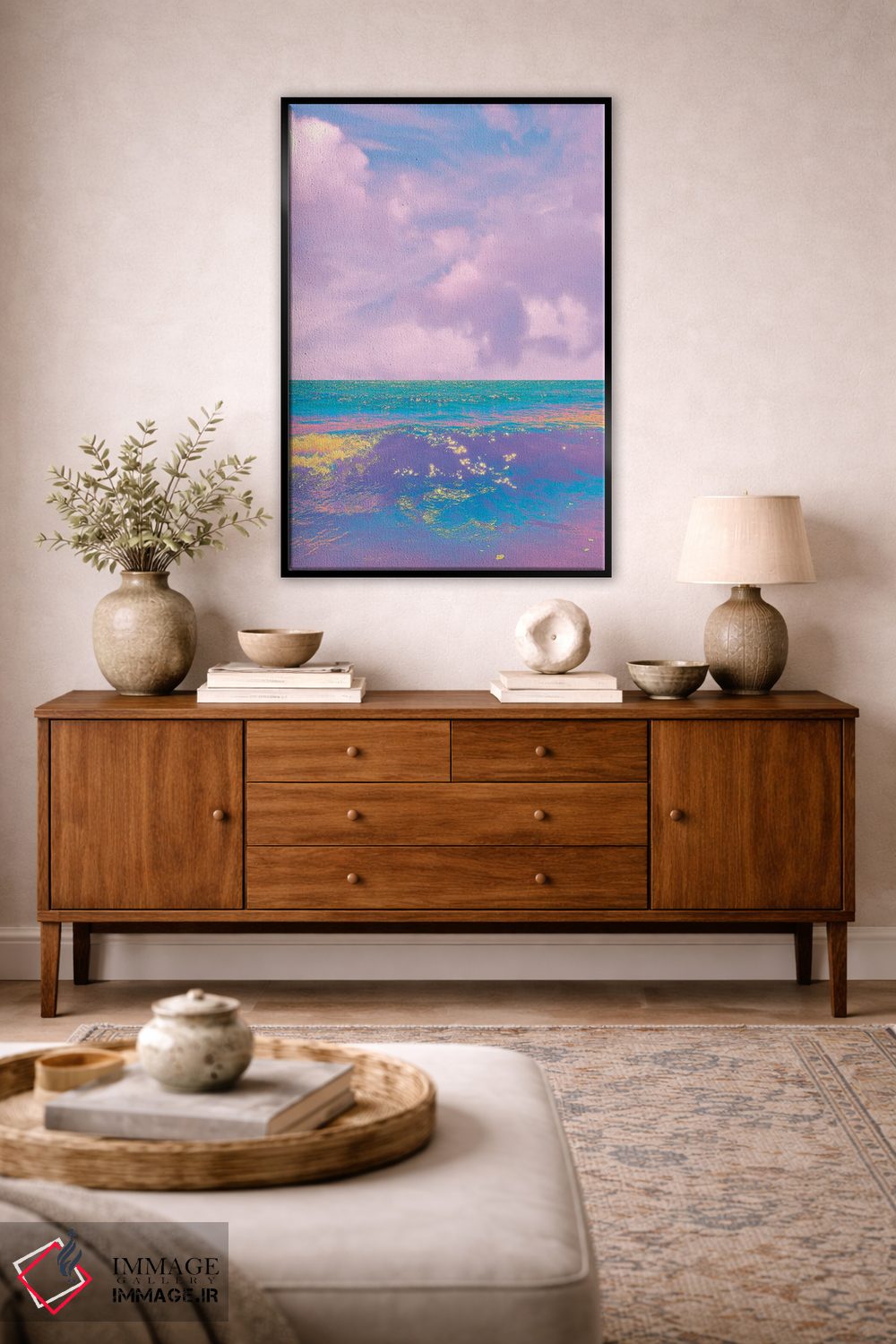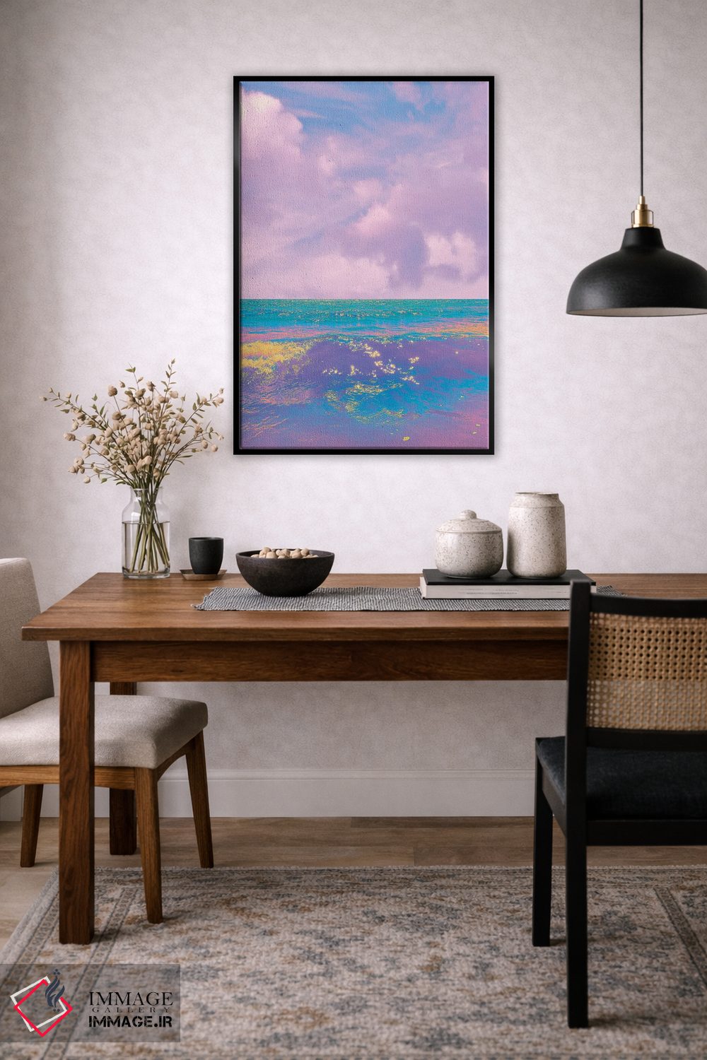 براساس پالت ترکیبی اثر، قاب تیک گرم (چوبی) پیشنهاد اول است و مشکی مات (فریم متوسط) مکمل. برای سفارشهای پروژهای با ابعاد و قابهای اختصاصی با ایماژ در تماس باشید.